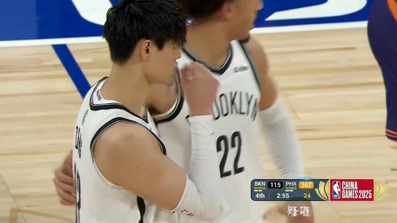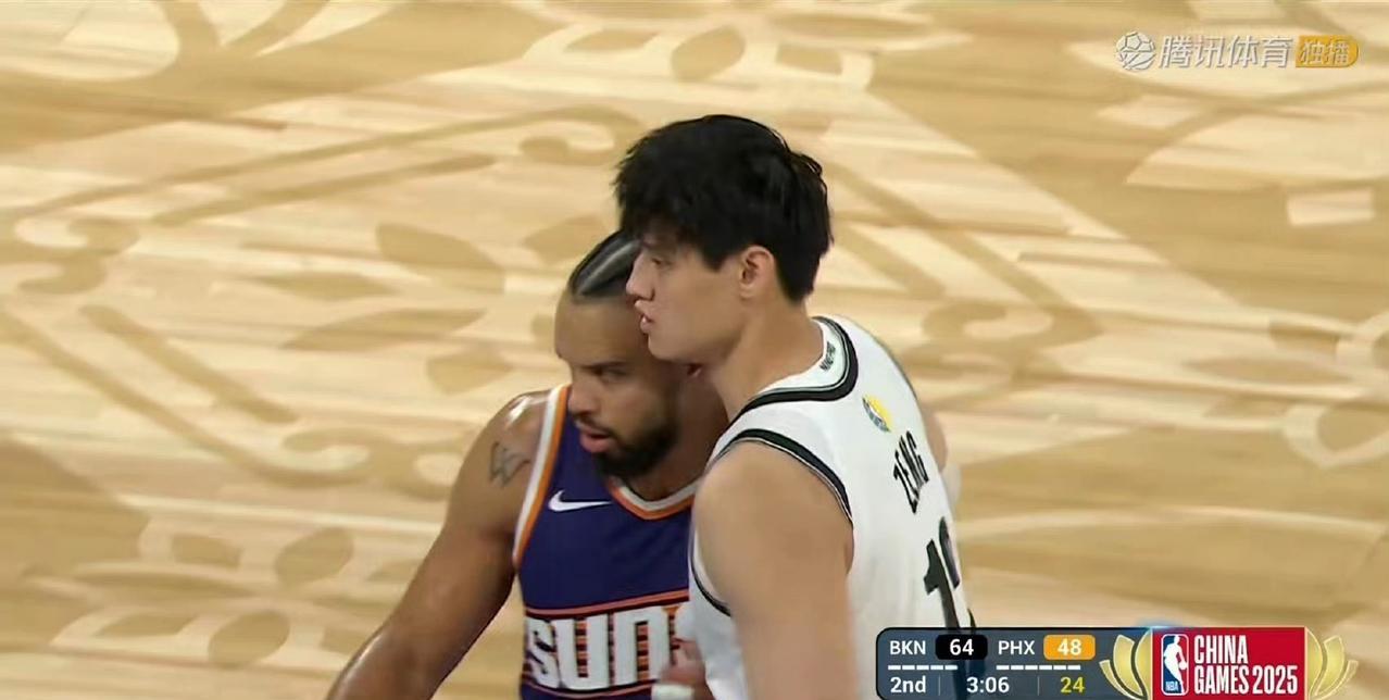 NBA中国季前赛第二节打了九分钟,曾凡博终于被换上场,现在一片欢呼。中国球迷等的