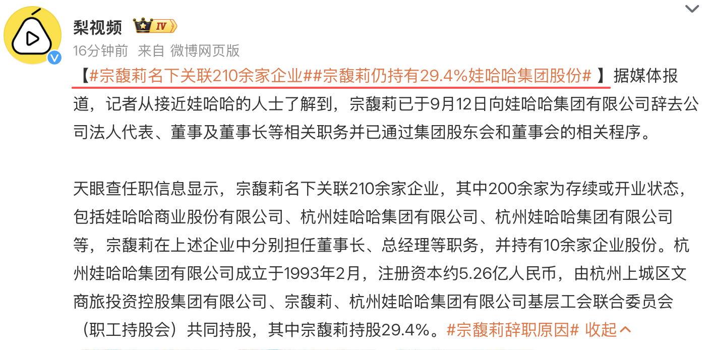 看到宗馥莉已经辞职 的新闻,似乎没有人关心现在娃哈哈是谁主持了,难道这不是最该关心的问题咩?[震惊],毕竟娃哈哈大股东是国资啊(虽然看网上信息说2021~2023收益为0.。。。。)