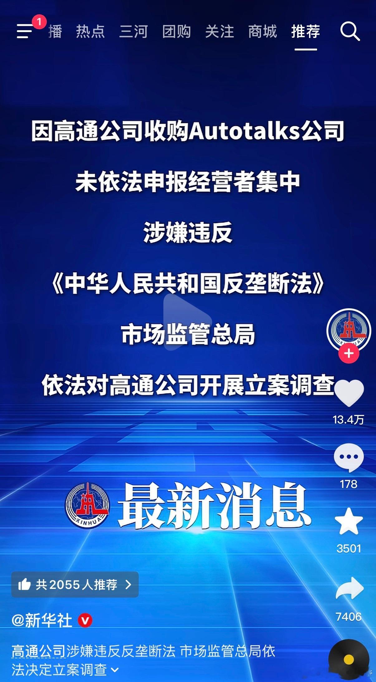 新华社:高通公司涉嫌违反反垄断法,市场监管总局依法决定立案调查!