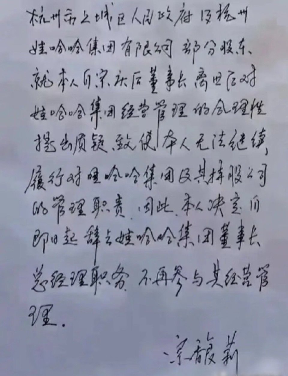 宗馥莉已经辞职 所以最终还是内斗失败了被迫辞职是吗?可惜了,能力这么强的一个富二代。居然还是手写的辞职信,字如其人,挺霸气的。期待看到她更好的发展吧!