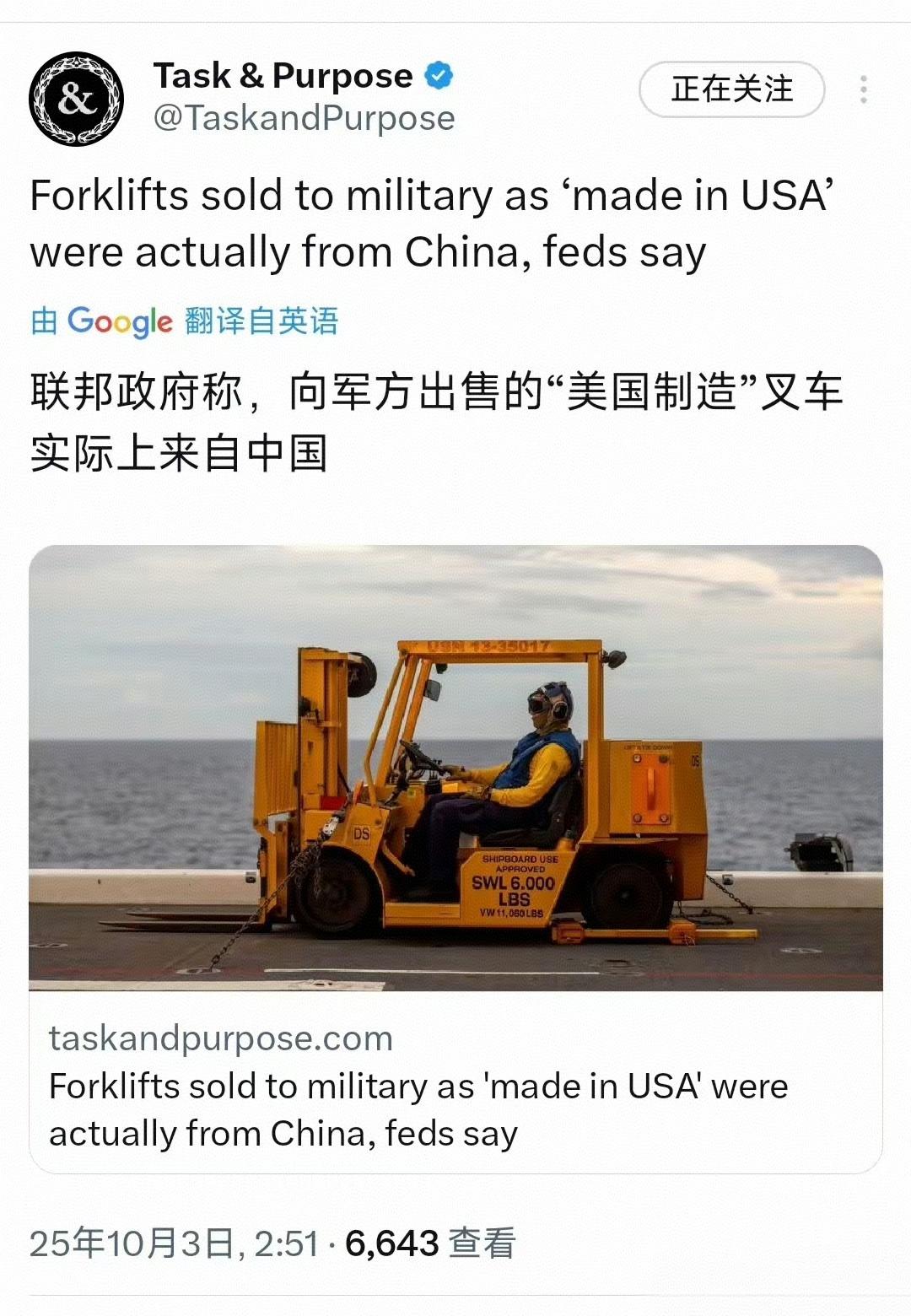 哦豁,咋个办,美国军方从供应商手上买的叉车,MADEINCHINA。为啥呢?