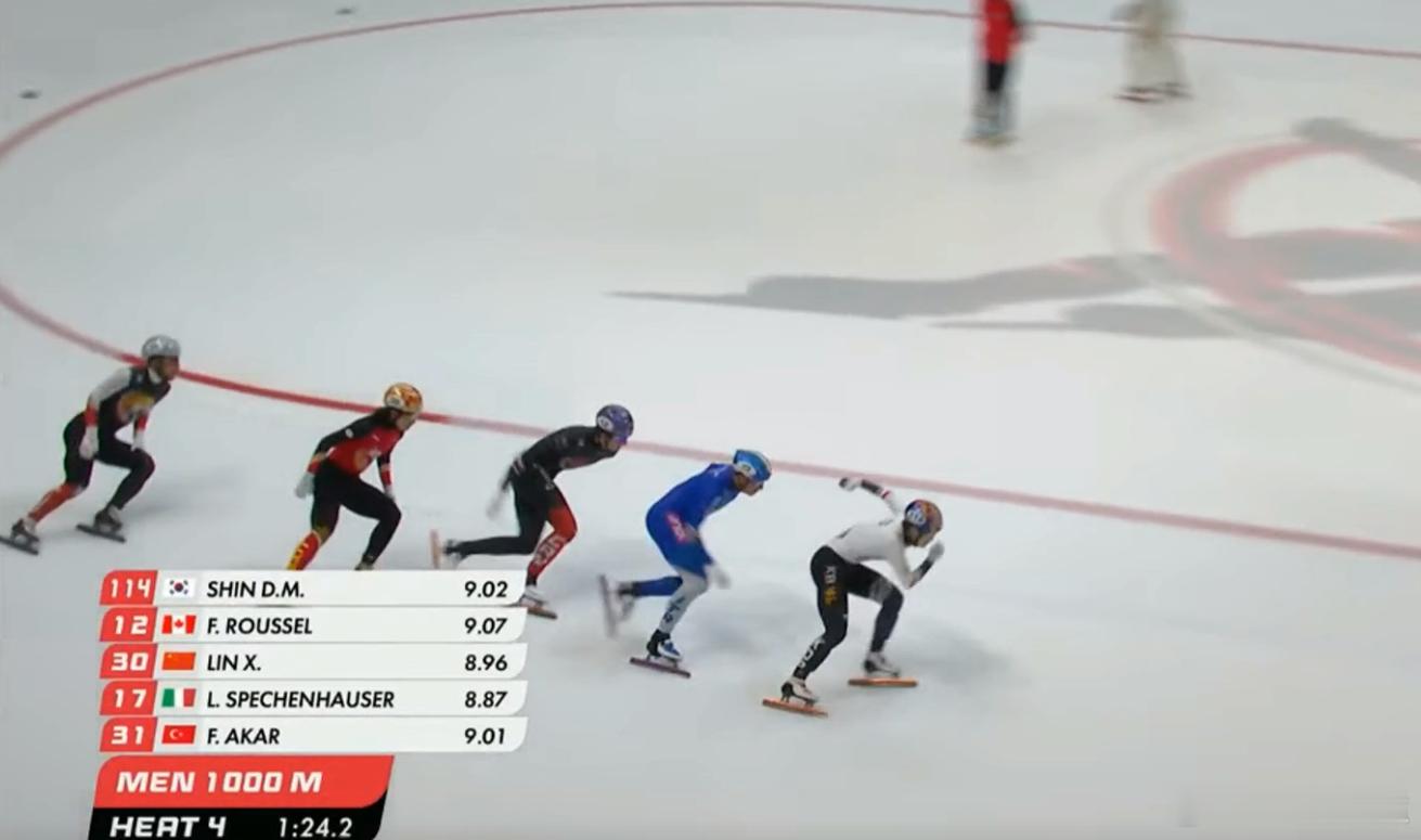 10月10日晚,202526赛季短道速滑世界巡回赛第一站-蒙特利尔站结束了男子1000米预赛第四组争夺。