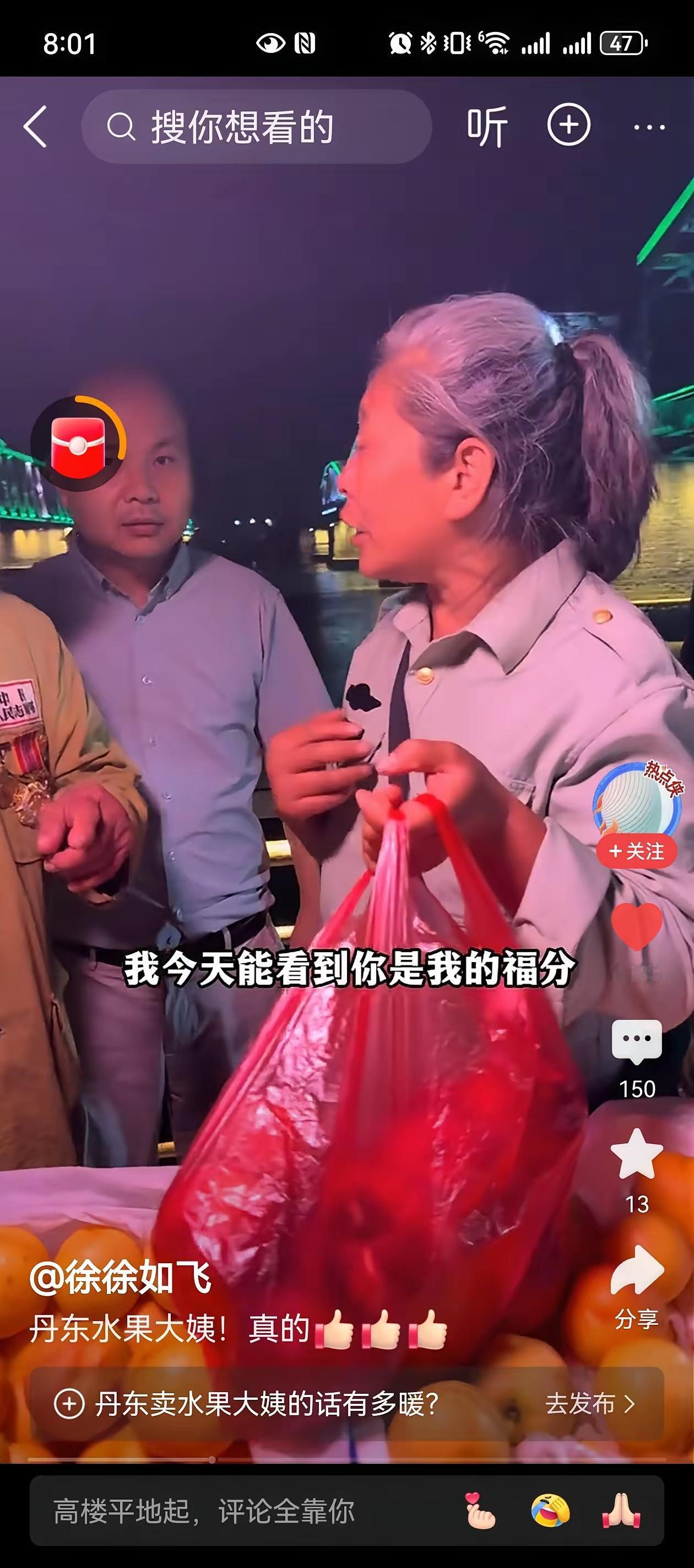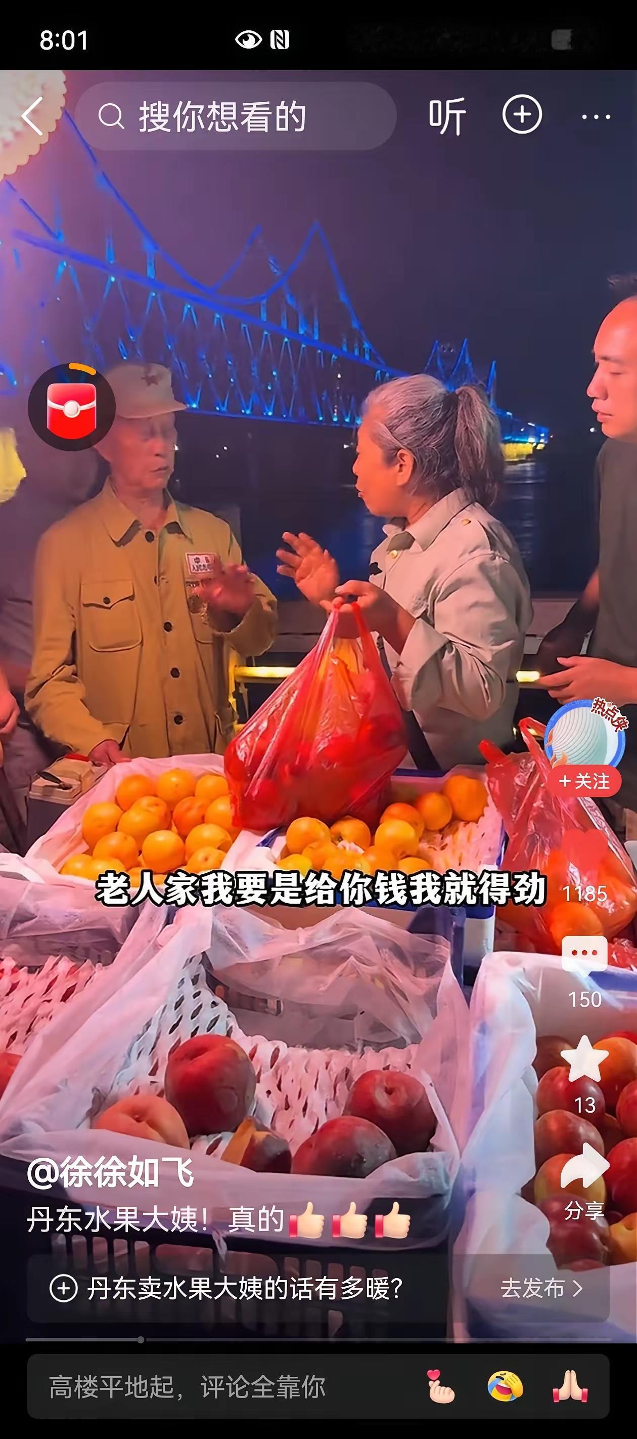 丹东的水果大姨火了!这下全国人民都知道她了!一位志愿军老战士来到丹东旅游,遇到了这位卖水果的大姨。大姨一听说老人是志愿军老战士,说啥都要给老人家装一些水果拿着吃。旁边的人说要给大姨付钱,她说啥也不同意。她说,我公公也是抗美援朝的,您今天能来到我们丹东这个英雄的城市,我能遇见你是我的福分。我还年轻,我今天能够站到这里那都是前辈们流血流汗给我们留下来的。我们永远记得那些为我们的幸福生活付出鲜血和生命的英雄们,水果大姨说出了我们的心声,希望有好心人能够告诉我大姨的摊位在哪里,如果我再去丹东,必去大姨的水果摊买水果去[祈祷][祈祷][祈祷] —— 视频一上网,点赞像下雪,评论区里全是“丹东大姨,等我!”有人把画面截成表情包:老战士摆手说“使不得”,大姨拎袋子追在后面硬塞,配字“英雄遇见英雄”。网友笑完又抹泪,一句话把大家整破防——“我年轻,能站在这儿,是前辈流血流汗换来的”。说白了,这就是咱老百姓最朴素的心声:谁替咱拼过命,咱就把谁当亲人。 大姨的摊位很快被人扒出来:丹东火车站出口,左手边第二棵银杏树下,红色遮阳棚写着“英雄城市水果摊”。名字都懒得换,直接上招牌,霸气!现在那儿成了打卡地,每天排长队,有人专门坐高铁来买两斤苹果,就为跟大姨合张影。大姨有点懵:“我就送点水果,咋还整出粉丝了?”她不知道,大家买的不是水果,是那份心意,是对志愿军老前辈的敬意。 有人好奇,大姨为啥这么大反应?她一句话揭开谜底:“我公公也是志愿军,五一年过鸭绿江,回来时耳朵震聋了半边。”老爷子在世时最爱讲抗美援朝,讲到战友牺牲就抹泪,讲到丹东解放就咧嘴笑。大姨听了几十年,耳朵起茧,心里却刻下一条信念:遇到志愿军,必须当自家人。这回真让她碰上了,哪还顾得上收钱?恨不得把整摊水果都塞进老人兜里。 老战士那边也被人扒出底细:八十九岁,山东临沂人,姓刘,当年是炮兵,炮弹震坏了听力,如今说话得靠吼。他去丹东,就想看看老战友埋骨的陵园,没想到先遇见大姨。他说:“那姑娘硬塞水果,我推都推不动,就像当年战友给我塞饼干,一模一样。”一句话,把网友又弄哭一片。有人留言:“刘爷爷别怕,以后丹东有我们,水果管够!” 热闹背后,也有冷言冷语。个别人说大姨“作秀”“蹭流量”。大姨听完一笑:“我摊位在这儿摆了十年,想作秀早作了。我就是心疼志愿军,心疼我公公,咋啦?”她干脆把摊位招牌改成“英雄城市水果摊,作秀勿扰”,硬气!网友们也力挺:“作秀?你作一个试试?能十年如一日?”“人家送水果,你送键盘,谁丢人?” 我看完视频,心里热乎乎的,也想起自己爷爷。他老人家也是志愿军,零下四十度啃冻土豆,腿被冻伤,一辈子走不快。小时候我不懂,嫌他走路慢,现在懂了,却来不及陪他再走一段。要是爷爷还在,我一定带他去丹东,去大姨的摊位,买两斤最甜的苹果,让老爷子坐在银杏树下,慢慢吃,慢慢聊,告诉大姨:您心疼的,是我亲爷爷。 大姨的火,不是偶然,是大家对志愿军感情的集体爆发。我们受够了“娘炮”和“流量”,受够了“谁红谁有理”,我们需要这种直来直去的真情:你为我拼命,我为你撑腰!丹东大姨给了我们一个出口,让我们把憋在心里的“谢谢”喊出来,把对英雄的思念化成实实在在的水果、拥抱、掌声。 所以,别急着散场。刘爷爷的山东老家,可以组织“志愿军后代游丹东”;大姨的摊位,可以挂上“志愿军免费吃水果”牌子;我们普通人,去丹东就买两斤水果,跟大姨合个影,发网上,让热度继续滚。让老战士们知道:你们没被遗忘,你们的血没白流,你们的名字,我们一代代传下去。 最后抄一段网友的话:“大姨的水果甜不甜?甜!比水果更甜的是人心。”丹东的风,吹过银杏树,吹过水果摊,也吹过我们每个人的心里。那股甜味,叫感恩,叫铭记,叫——英雄永远不会独行。 各位读者你们怎么看?欢迎在评论区讨论。