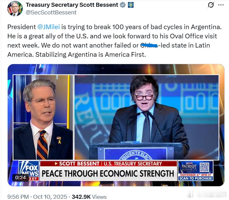 米莱总统正在努力打破阿根廷百年来的恶性循环。他是美国的重要盟友,我们期待他下周访问白宫。我们不希望拉美出现另一个失败或由**主导的国家。稳定阿根廷符合“美国优先”的原则。