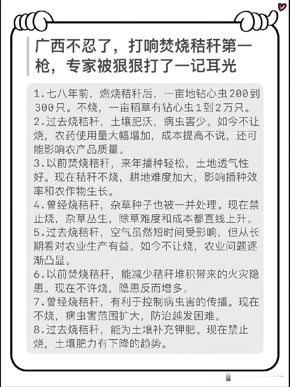专家提倡不能焚烧秸秆,给农民带来了什么?有很多人发现钻心虫越来越多,为什么呢?由于秸秆不能焚烧,很多钻心虫就在秸秆里面,有的钻心越冬,给钻心虫带来了更好的生存环境。 又有人说了,有虫你打农药就好了。但是你想想农民一年靠这几亩地就赚个万把块钱,这经常打农药不得花个五六百? 所以专家说焚烧秸秆有害环境,另一方面看是不是想拉动农民消费,掏农民口袋的辛苦钱?