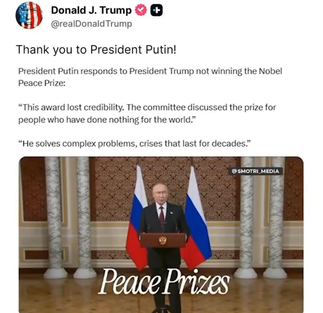 🚨 最新消息:特朗普总统感谢弗拉基米尔·普京,此前普京称诺贝尔和平奖“已失去信誉” 普京:“委员会曾讨论过将诺贝尔和平奖授予那些对世界毫无贡献的人。” “美国现任总统究竟值不值得?我不知道。他确实为解决这些持续数年甚至数十年的复杂问题和危机做了很多工作。他真心希望乌克兰危机能够得到解决。” 🚨 JUST IN: President Trump THANKS Vladimir Putin after he said the Nobel Peace Prize has "lost credibility" Putin: "There were cases when this committee discussed the Nobel Peace Prize for people who have done NOTHING for the world." "Is the current president of the USA worthy or unworthy? I don’t know. He really does a lot to solve such complex problems, crises that last for years or even decades. He sincerely aspires for this crisis in Ukraine to be resolved.”