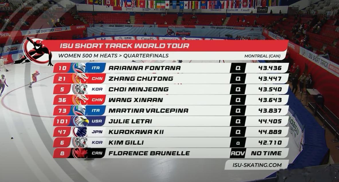 加拿大选手金布廷以42秒549拿到预赛总第一。短道速滑世界巡回赛短道速滑中国短道速滑队
