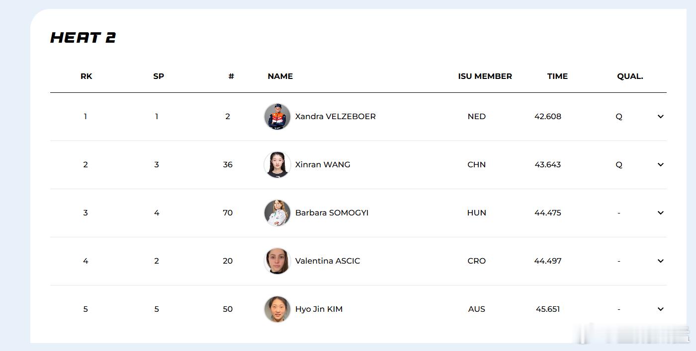 第二组荷兰选手桑德拉-费尔泽布尔实力突出,她以42秒608拿到小组第一,王欣然的实力在该小组仅次于费尔泽布尔,她以43秒643列小组第二晋级。