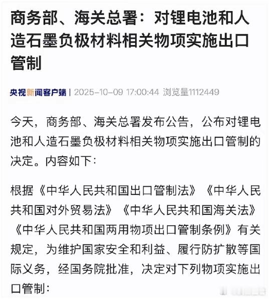 下午5时整,商务部、海关总署发布公告:对锂电池和人造石墨负极材料相关物项实施出口管制。