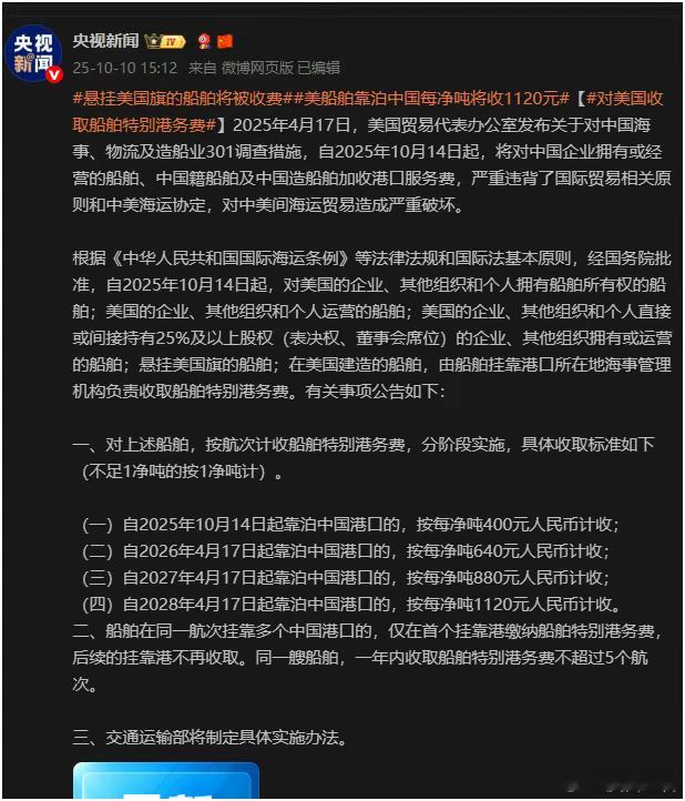 这样一来,我们不仅仅是破了必和必拓的价格控制,还顺带的又双叒叕削弱了美元地位。而无论是印度购买俄罗斯能源使用人民币结算,还是必和必拓出品铁矿石使用人民币结算,或者国庆节长假之后的这一波组合拳,都在清清楚楚、明明白白的告诉美国还有整个西方:你们在搬起石头砸自己的脚,是在作死!最后,对于美国对与中国相关的船加收港口服务费,我国对等反制,同日生效。既然美帝不体面,那就帮他体面吧。