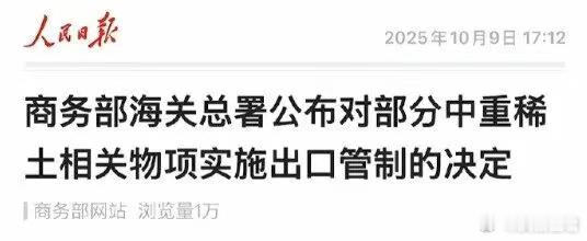 下午5时12分,商务部、海关总署公布对部分中重稀土相关物项实施出口管制的决定。