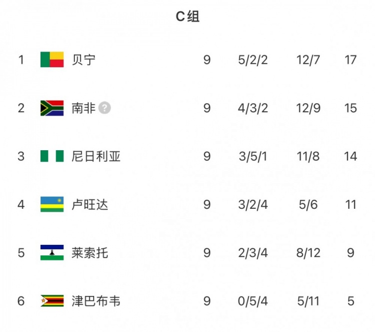 9轮过后,贝宁以17分领跑C组,领先第二名南非2分,第三尼日利亚3分。