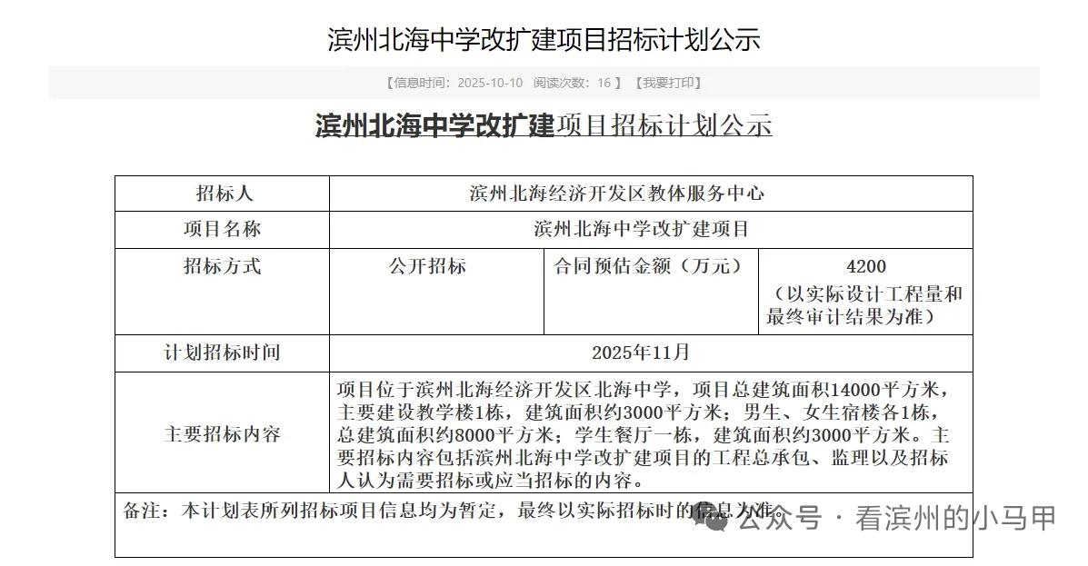 滨州市一中学将改扩建 2025年10月10日,《滨州北海中学改扩建项目招标计划公示》发布,山东滨州北海经济开发区计划投资4200万元对北海中学进行改扩建,项目总建筑面积14000平方米,主要建设教学楼1栋,建筑面积约3000平方米;男生、女生宿楼各1栋,总建筑面积约8000平方米;学生餐厅一栋,建筑面积约3000平方米。主要招标内容包括滨州北海中学改扩建项目的工程总承包、监理以及招标人认为需要招标或应当招标的内容。 北海中学位于滨州北海经济开发区北海二路以南,北海四路以北,滨港二路以西,滨港三路以东。滨州北海中学是一所公办学校,由滨州魏桥国科教育集团实施托管办学,旨在解决城镇中小学大班额问题,并结束北海经济开发区没有高中的历史,实现从小学到高中的教育全覆盖。 来源 综合滨州市公共资源交易中心