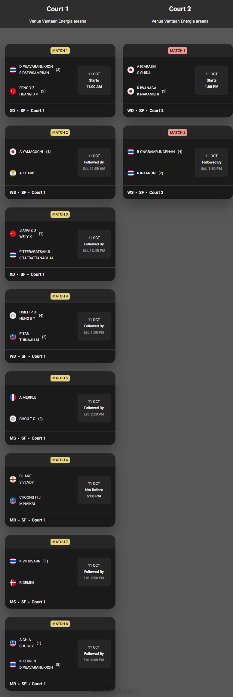 【北极羽毛球赛半决赛赛程对阵】2025年北极羽毛球公开赛羽联超级赛 10月11日芬兰万塔,2025世界羽联超级500北极公开赛将进行半决赛,比赛将于北京时间16时开始,国羽赛程对阵如下,完全赛程对阵见图: