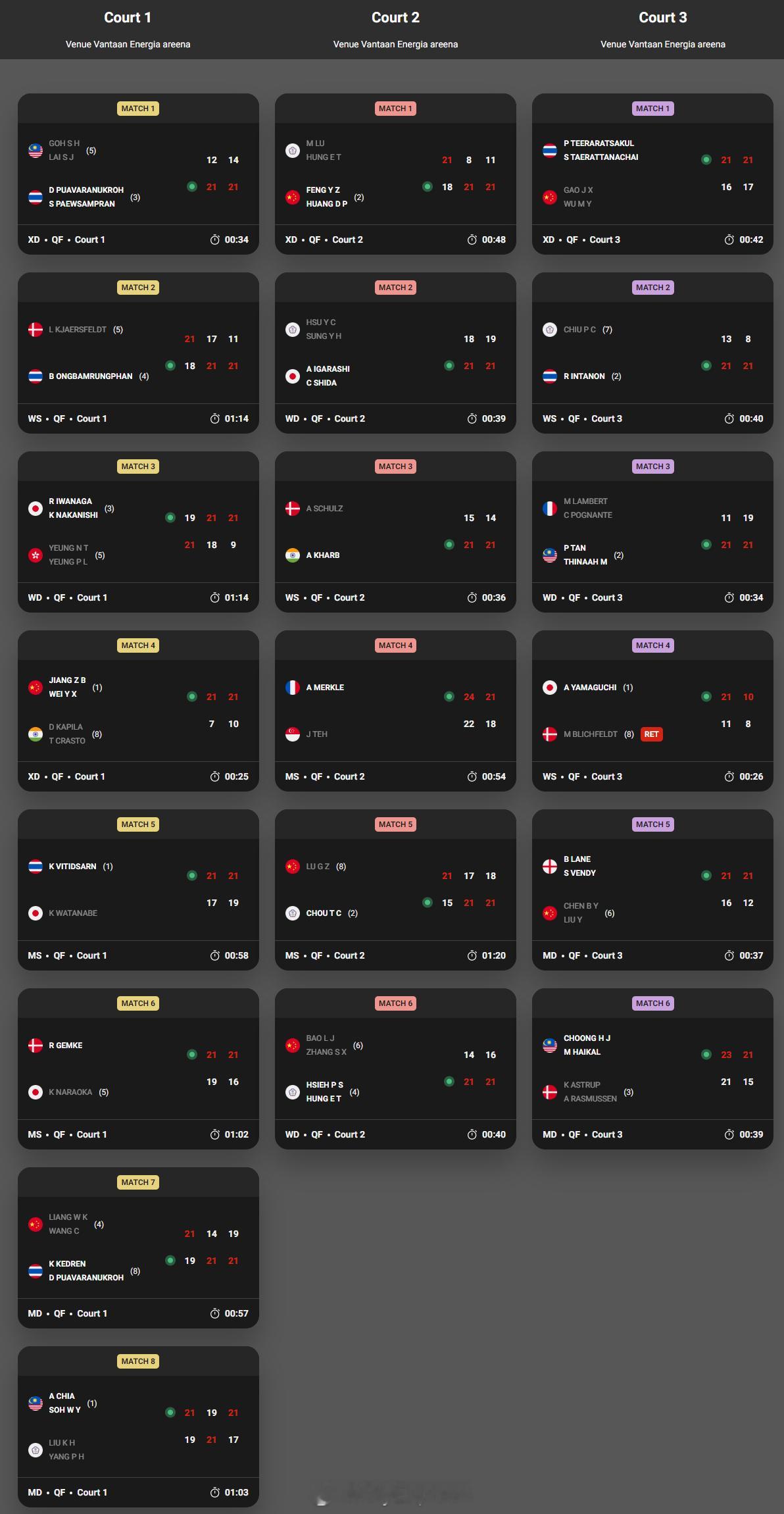 【北极羽毛球赛1/4决赛国羽2胜5负 仅俩混双进四强】梁王组合止步北极赛8强2025年北极羽毛球公开赛羽联超级赛 10月10日芬兰万塔,2025世界羽联超级500北极公开赛结束1/4决赛,国羽2胜5负,只有两队混双进入四强。国羽赛果如下,完全赛果见图: