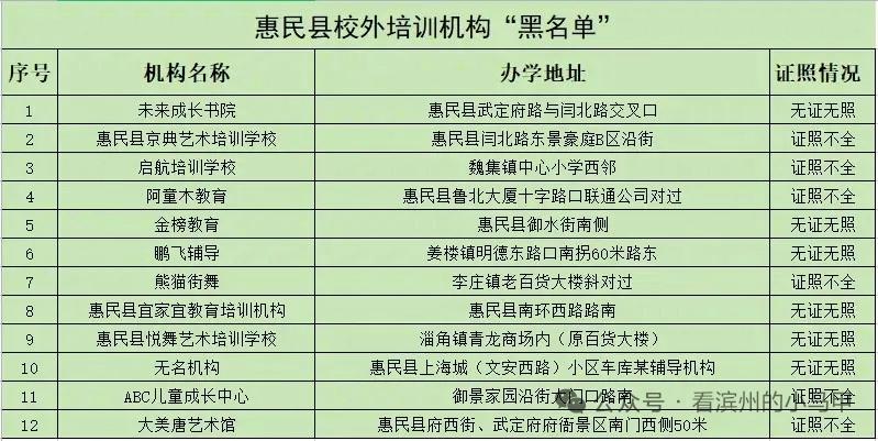 滨州惠民县发布2025年第一批校外培训机构“黑名单”(下图)
