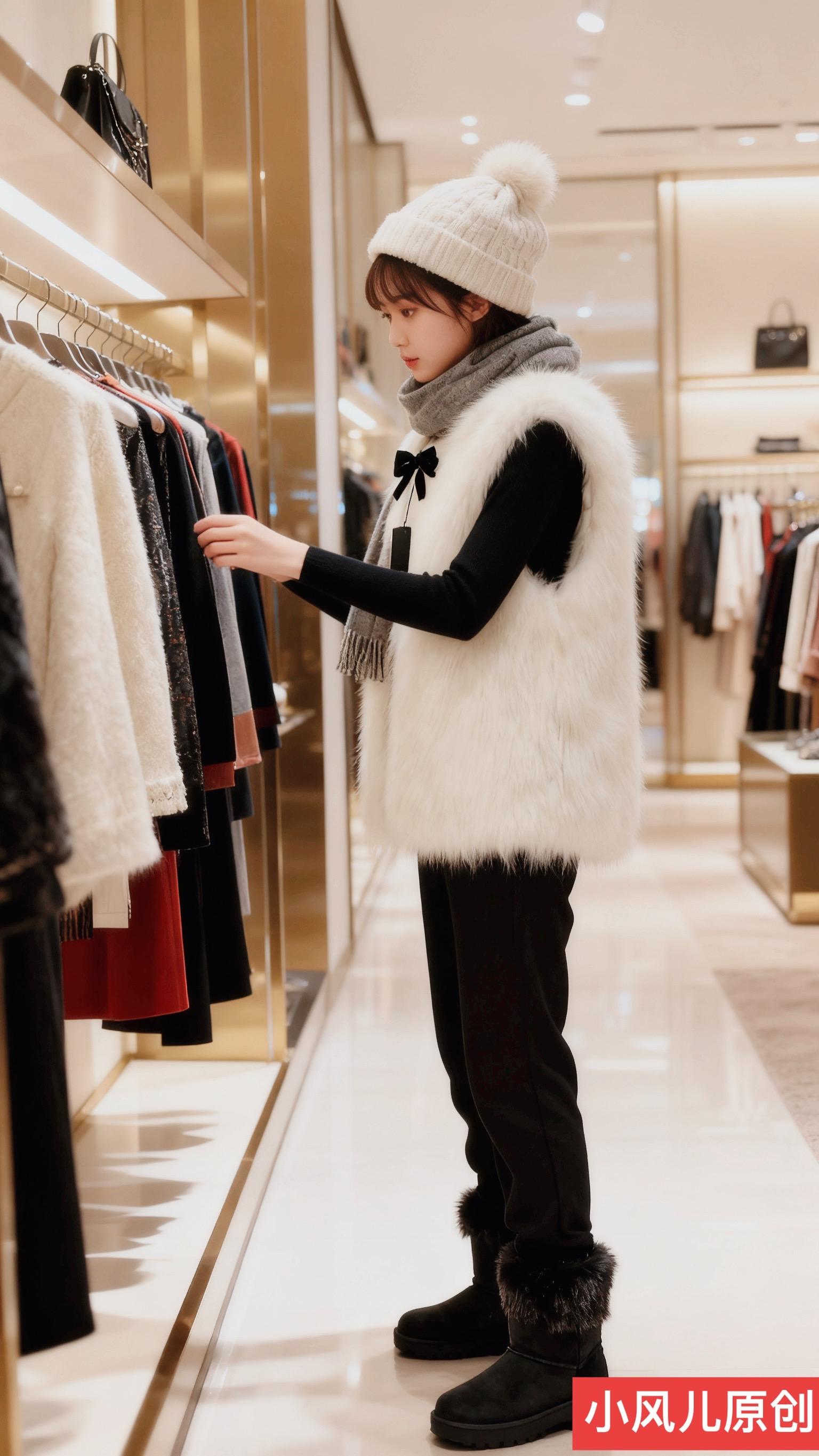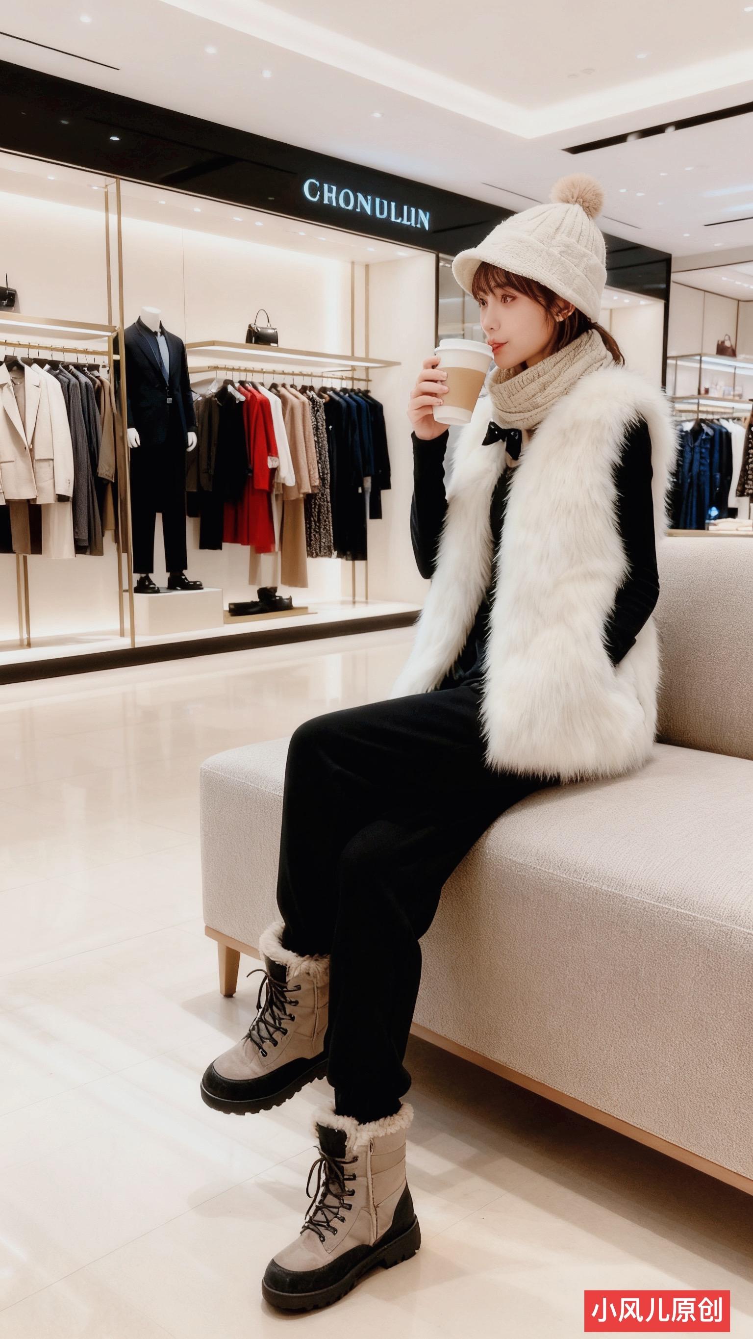 毛毛马甲的柔软蓬松,在雪景映衬下,更显温暖与时尚,营造出冬日里舒适雅致的购物与创作氛围。