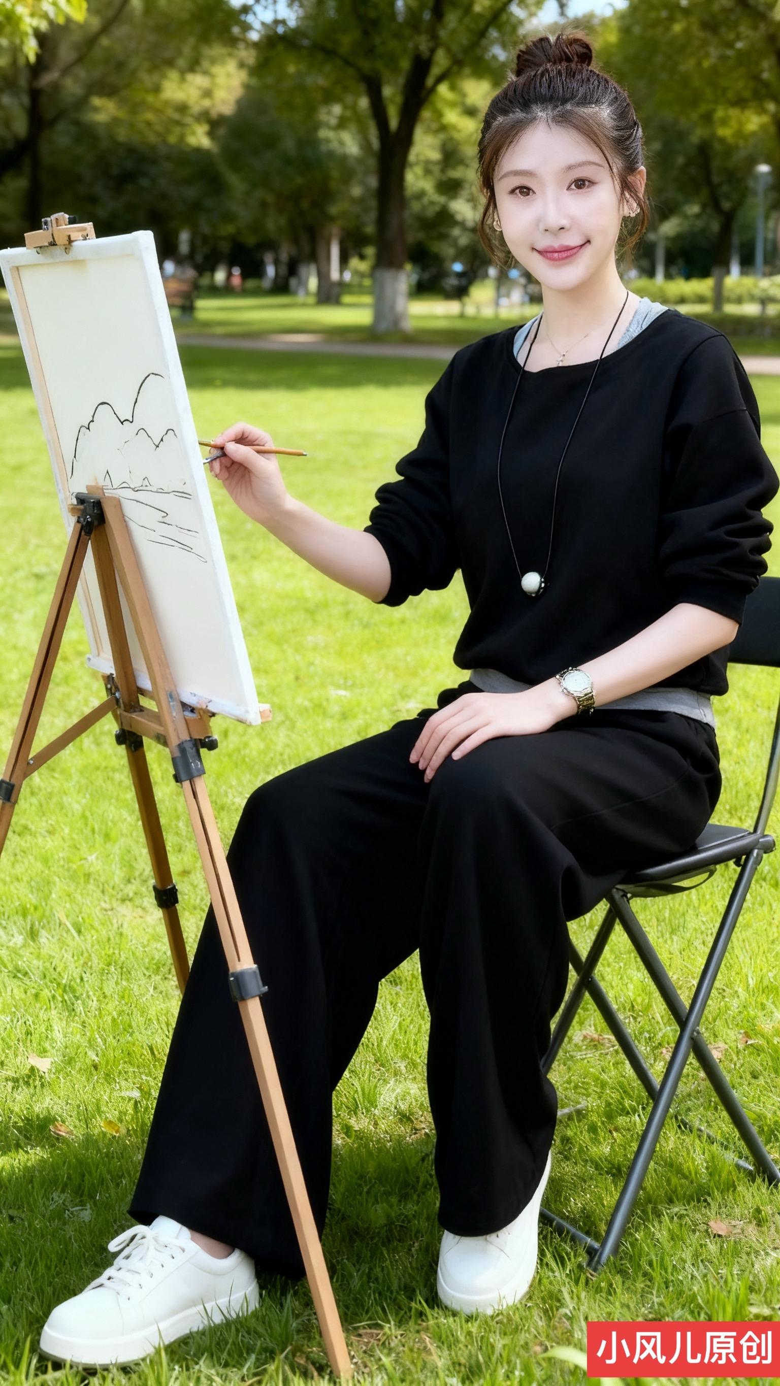 公园绿意背景,服装的休闲版型让写生时行动自如,黑调简约易搭配,尽显随性文艺范。
