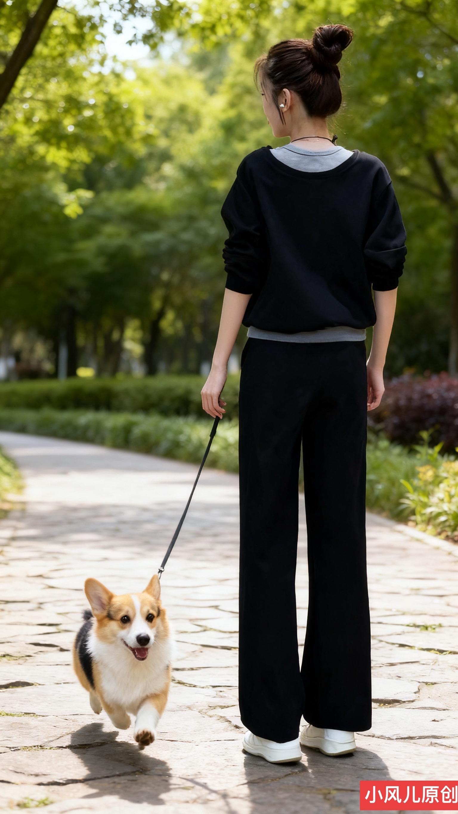林荫步道环境宜人,穿搭的阔腿裤修饰身形,整体风格休闲百搭,遛柯基时既舒适又能展现活力,是日常户外的绝佳选择。