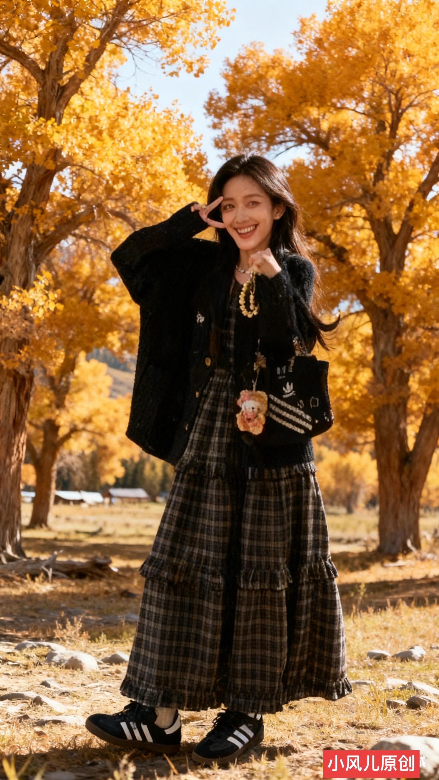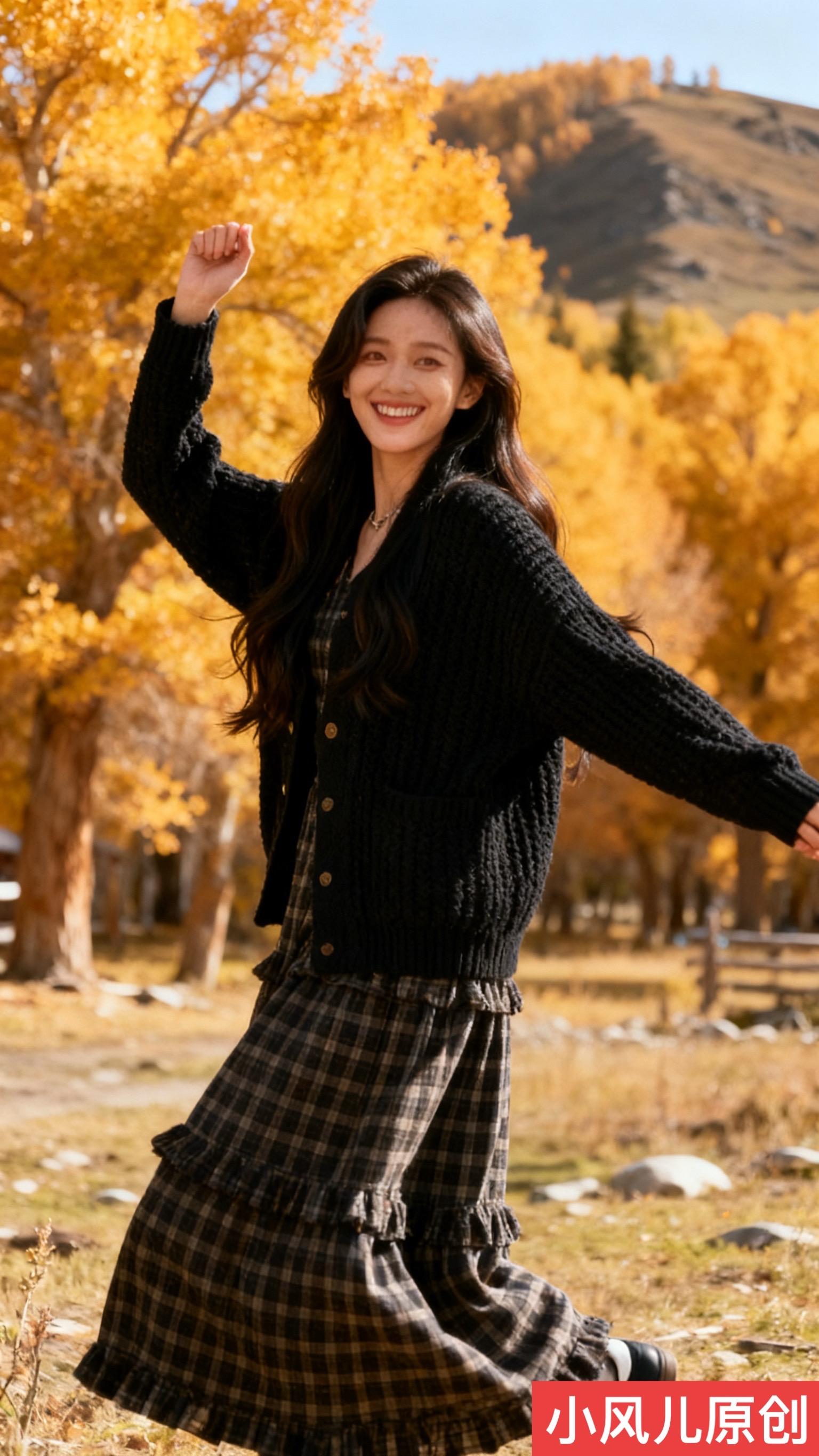 慵懒风时尚两件套。胡杨林满目金黄,树木层叠如油画。 黑色针织开衫,内搭绿黑格纹多层荷叶边慵懒两件套 ,脚踩黑白条纹运动鞋,搭配白色袜子,颈间彩珠项链点缀,在林间欢快舒展双臂,尽显秋日活力。 金黄与远山相映,木屋、溪流点缀其间。 黑色带金扣外套,内搭黑灰格纹多层荷叶边慵懒两件套。黑白条纹运动鞋配白袜,长发飞扬中跃起,将秋日的灵动与欢快定格。 河畔胡杨金黄绚烂,溪流与石块勾勒出自然野趣。 黑上衣配绿黑格纹多层荷叶边,蹲身开心喂着棕白小牛,服装细节与前两张呼应,在秋日牧趣中尽显温柔惬意。