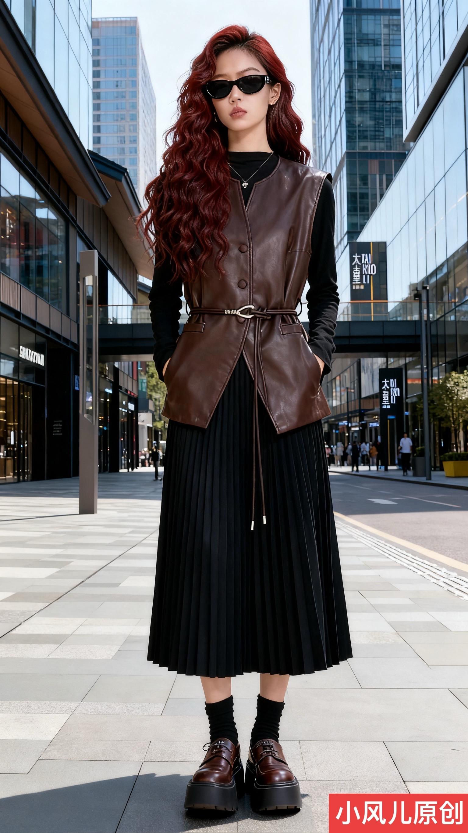 皮上衣中长款两件套。繁华街区,建筑时尚现代。棕色皮质马甲,内搭黑色...