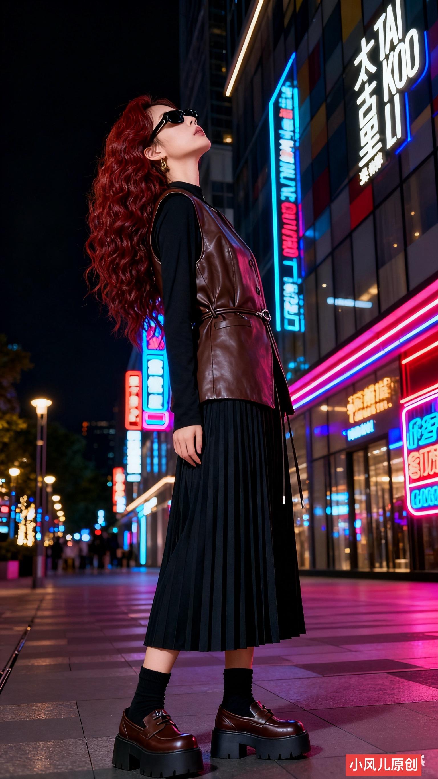 繁华街区另一处潮街,背景店铺设计前卫。同款穿搭下,人物或侧身摆拍,皮质马甲的质感与百褶裙的垂坠感碰撞,在潮流地标中诠释个性穿搭。