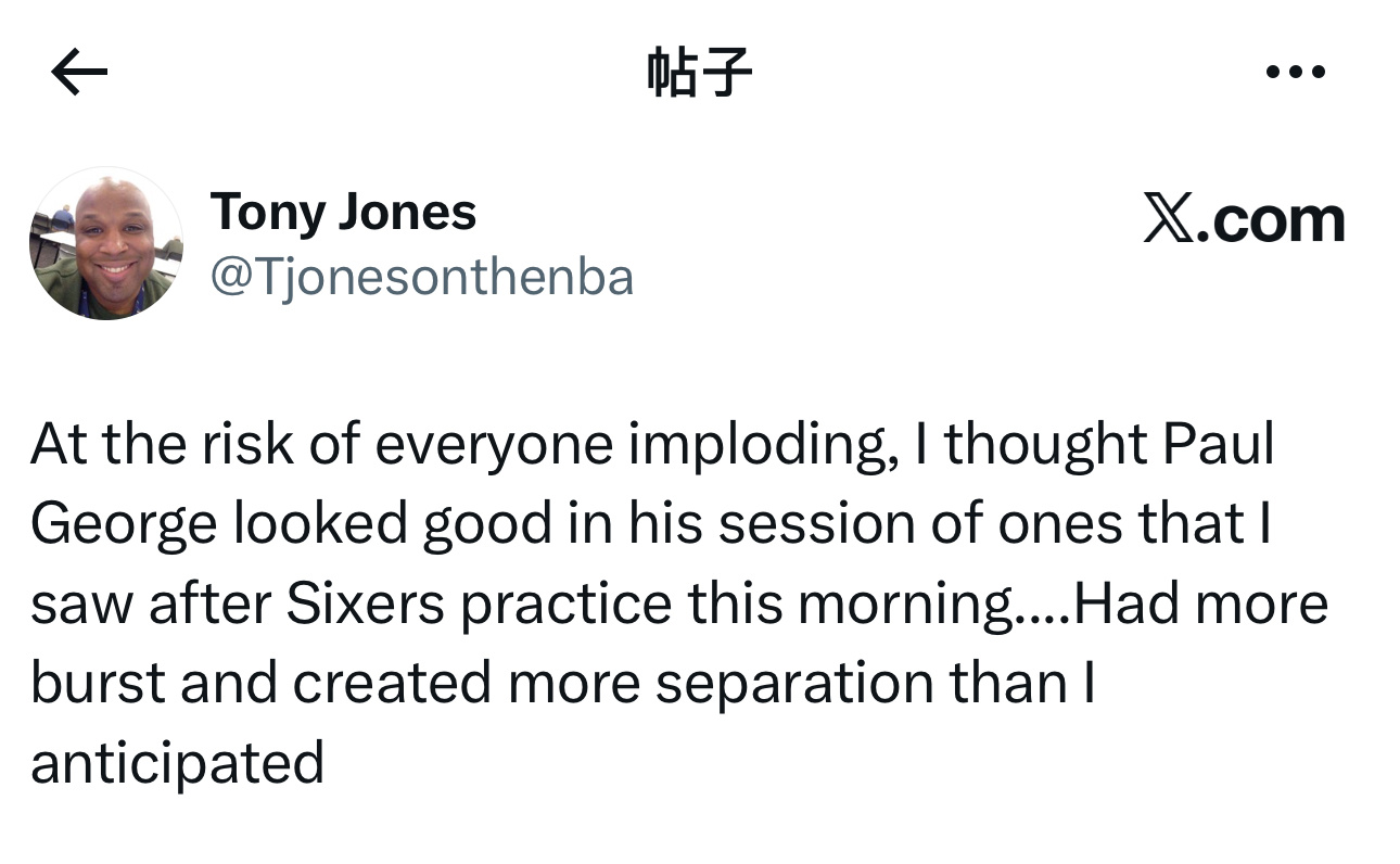 费城记者TonyJones更新社交动态,评价昨日保罗·乔治参与单挑对抗训练的表