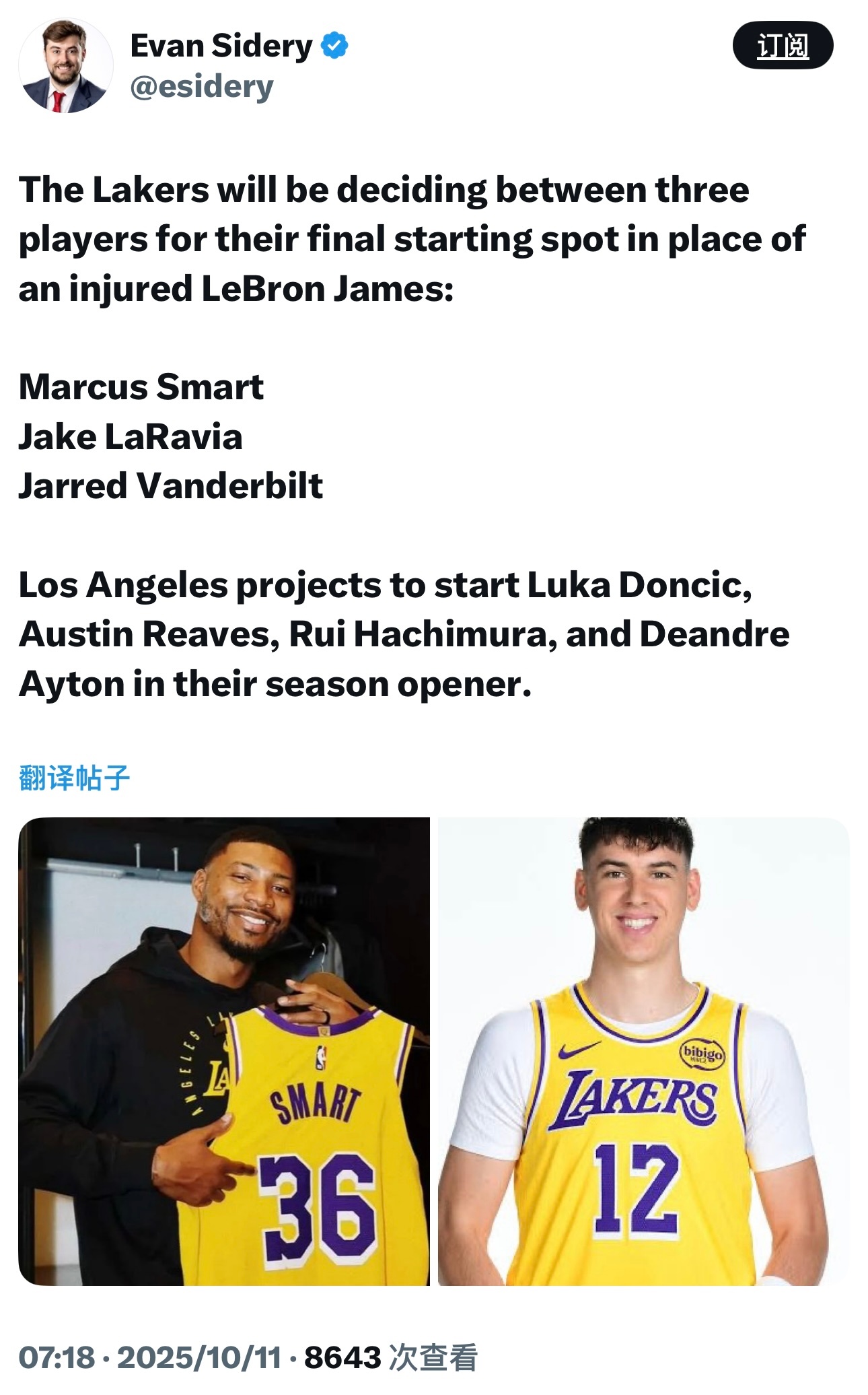 湖人新赛季揭幕战首发阵容已经确定了四人(东契奇、里夫斯、八村垒、艾顿),由于詹姆斯受伤,第五名首发球员将在拉拉维亚、斯玛特和范德比尔特之间做选择。