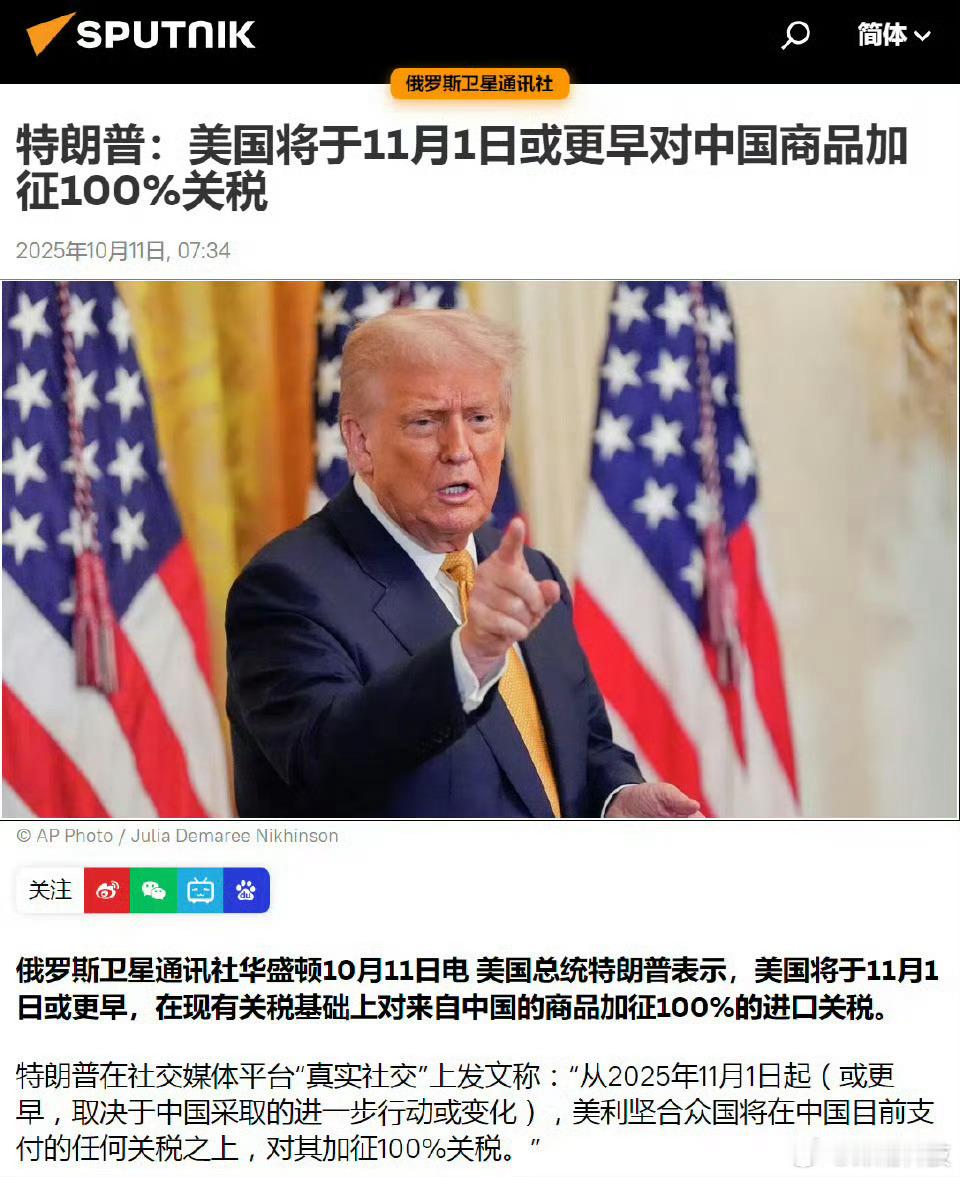 特朗普表示要对华加征100%关税 ,并对所有关键软件实施出口管制。