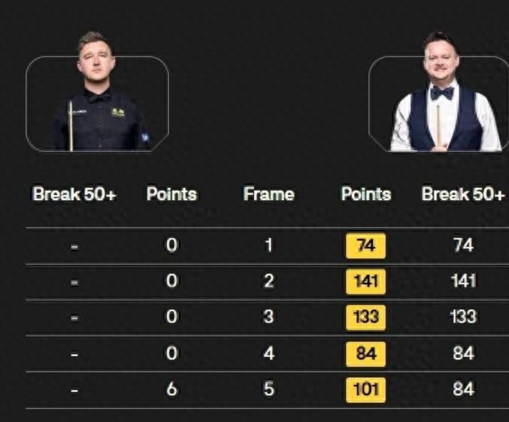 本场比赛墨菲状态爆棚,首局打出单杆74分,为比赛奠定基调。另一边的威尔逊却迟迟找不到节奏,只能眼睁睁看着比赛继续进行。第二局和第三局,墨菲分别打出单杆141分和133分连续两杆破百。此后两局,墨菲又分别打出两杆单杆84分,直落5局战胜威尔逊晋级。