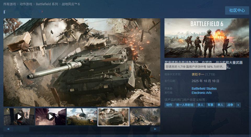SteamDB数据显示,《战地风云6》在Steam上最高同时在线人数已突破74万。但本作目前好评率仅为56%,“褒贬不一”,给出差评的玩家表示正式版游戏存在升级太慢、排队太久、对局内人机过多、中文配音尴尬、地图设计不合理、角色机动性太低等问题。 ​​​战地6国区评价褒贬不一 战地6发售 ​​​