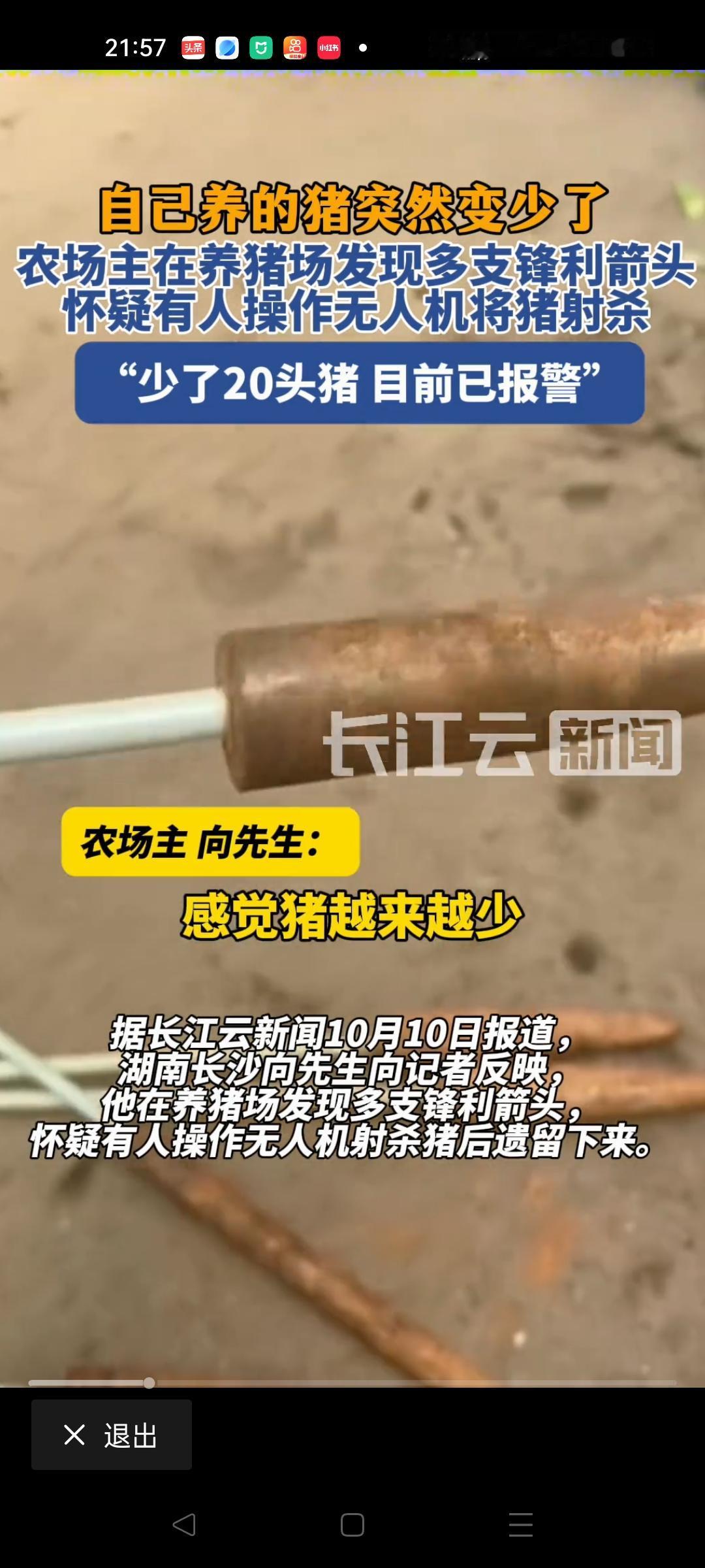 湖南长沙,一男子开养猪场,他发现猪场的猪突然变少,于是去寻找,不料竟在猪场发现15支锋利的箭头,每支箭头有一米长,男子少了20头猪,他怀疑是有人操作无人机将猪射杀了,现已报警处理! 据长江云新闻10月10日报道,向先生像往常一样巡场清点,可越数心里越沉,原本近百头的猪群里,成年大猪少了足足20头。 这不是零星走失,看着空了大半的圈栏和散落的猪食,他断定事情不简单,沿着猪场围墙和茶园边缘仔细搜寻,没找到猪的踪迹,反倒在草丛里、土坡下发现了让人心惊的东西:一支支闪着冷光的金属箭头。 这些箭头不是乡下打猎用的小箭,每支足有近一米长,握在手里沉甸甸的,称了下竟有一斤重,箭头磨得锋利,能轻易划破布料。 向先生蹲在地上数了数,不算埋在土里没挖出来的,已经找到15支。 他想起最近猪是夜里少得快,山场范围广,猪群散养着活动,之前装的监控根本覆盖不过来,不少角落都是盲区,夜里黑灯瞎火的,谁能在这么大的地方精准“带走”20头猪? 再看着这些箭头,一个念头冒了出来:会不会是有人用无人机干的? 这不是向先生第一次遇到牲口丢失的事。 之前猪场周边的农户丢过羊,当时没找到线索,大家只当是野物拖走了。 现在看着这些箭头,他越想越觉得不对:无人机能装热成像仪,夜里再黑也能看清猪的位置,从天上往下投这种重箭头,猪被射中后,再趁夜色把尸体运走,监控根本拍不到。 这么一来,猪少得蹊跷、箭头出现在山场,这些疑问就都能串起来了。 更让他心疼的是,丢的20头都是能出栏的成年大猪,按现在的市场价算,一头猪能卖三千多,20头就是六万到七万块钱。 这是他养了大半年的心血,就这么不明不白没了,换谁都受不了。 他没敢耽搁,当天就抱着几支箭头去了当地派出所报案,把发现的情况、猪丢失的时间规律和自己的猜测一五一十说了。 消息随着长江云新闻的报道传开来,不少人看到那支近一米的箭头都犯嘀咕:这么重的箭头, 能射倒几百斤的猪,要是不小心对着人,后果不堪设想。 有人说,现在民用无人机越来越普遍,本是用来航拍、撒农药的好工具,怎么就成了偷猪的“帮凶”? 也有人担心,要是这种办法被用到偷猎野生动物上,山里的鸟兽怕是要遭殃,甚至有人怕这手段被用在人身上,那就是大隐患了。 今天的分享到这里就结束了,大家对此事有何看法,欢迎在评论区留言和讨论,感兴趣的可以点击头像加关注,我将每日更新优质内容,我们下期见。 信源: 原文登载于长江云新闻2025年10月10日关于《养猪场发现多支锋利箭头,农场主怀疑无人机射杀猪后遗留》的报道