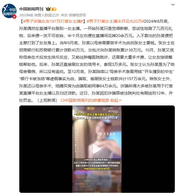 男子诈骗女友197万打赏女主播从刷几百元到骗 280 多万,孙某的打赏之路越走越歪。虚拟的主播追捧真能比现实的亲情爱情还重要?他该好好想想什么才是真正值得珍惜的。
