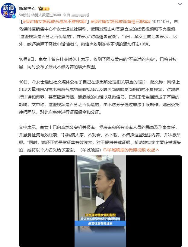保时捷女销冠被合成AI不雅视频希望大家能多给牟女士一些支持和鼓励,而不是冷漠围观