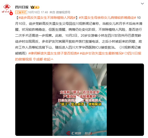 徒步甘孜失温女生最新情况律师表示,临时徒步“搭子”对同伴负有有限安全保障义务