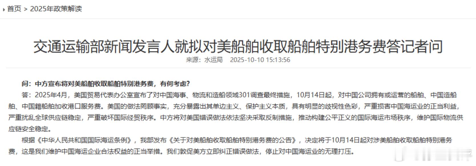 这一回,中国出手的地方,不在华尔街,不在芯片,而是在大海。10月10日,中国交通运输部宣布,自10月14日起,对美国船舶按航次收取港口特别费用。听上去冷静克制、条理清晰,但全世界的航运业都听懂了:中美这场经济对撞,从陆地打到了港口。