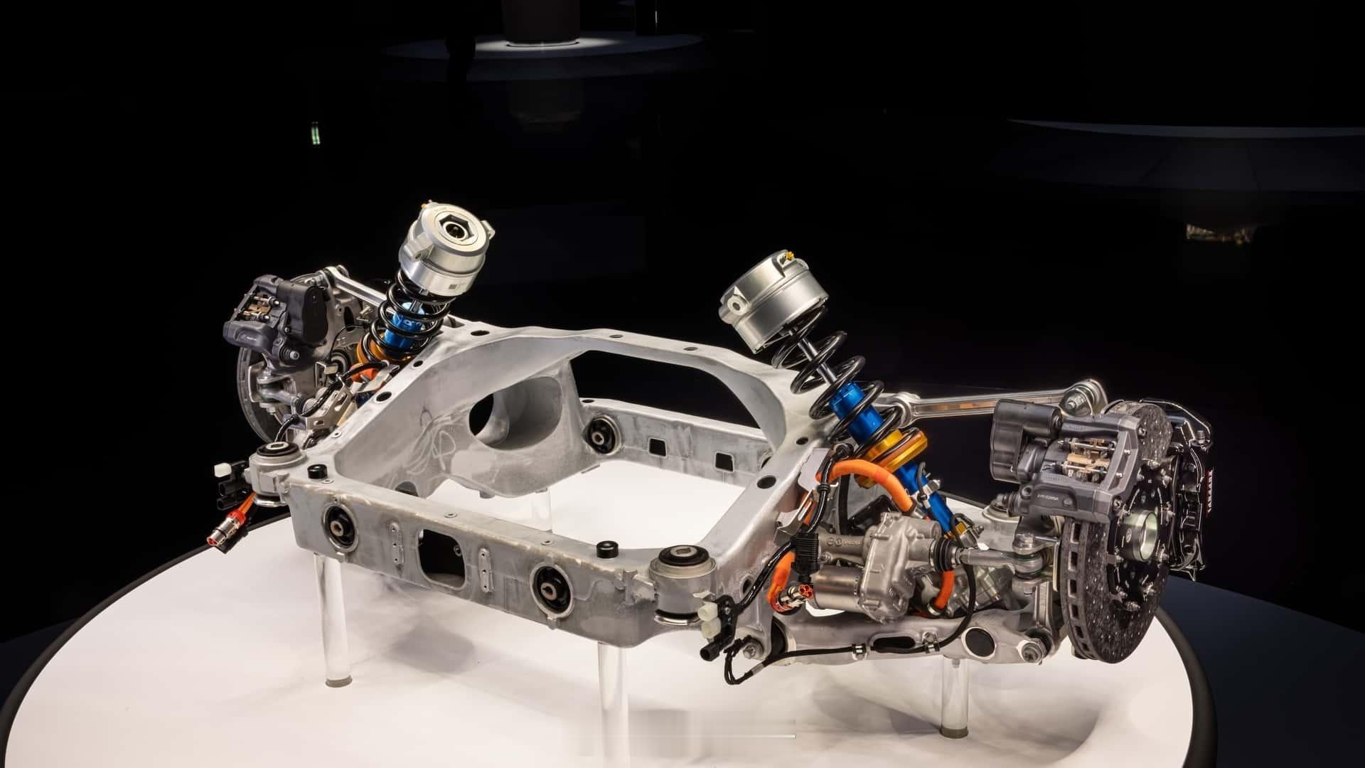 电机用的是跟F80电机相同的Halbach磁阵技术。电池组完全集成于车身底板,能量密度195 Wh/kg,车重2.3吨,重心比同等燃油车还低80mm。