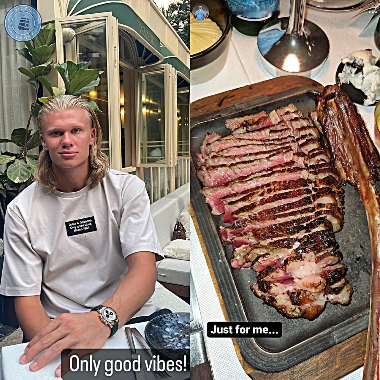 曼城当家球星哈兰德在比赛结束后,会在自家花园里享用用烤架烹制的极具英式风味的美食来庆祝。这位曼城的进球机器,在比赛胜利,尤其是自己取得进球后,总是会吃烧烤,再配上约克郡布丁以及各种配菜来庆祝自己的胜利。 为了保持自己的出色身体状态,哈兰德每天会吃六顿饭,来保证能量的摄入。哈兰德透露说,他经常会和效力于富勒姆的挪威老乡博格一起聚餐。 “我们只是吃些美味的食物,开开心心地享受生活。周日会享用烤肉、烤土豆、肉汁,还有约克郡布丁。我们玩得很开心,有位来自挪威的伙伴在身边,真是太棒了” 挪威队友乔舒亚-金透露了哈兰德保持绝佳体型的秘诀:那些惊人的饮食习惯以及巨大的食物摄入量。“他简直是个奇才,我从来没见过有人像他那样吃得那么多。”乔舒亚-金说道。