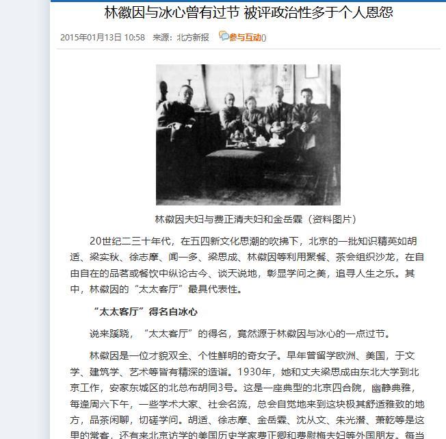 1933年,冰心发文暗讽林徽因“生活不检点,成天让男人围着她转,简直是伤风败俗”
