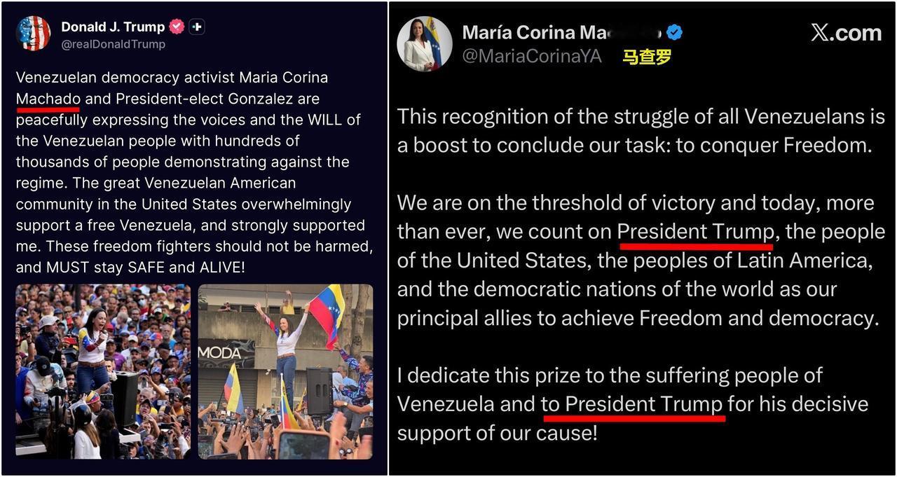 今年诺贝尔和平奖得主马查多和Trump,两人其实都是互相欣赏的。马查多和Trump的一些内阁成员,如卢比奥,关系都很好。 今年1月的时候,Trump就曾发帖支持马查多,赞扬她 “以和平方式表达委内瑞拉人民的声音与意志.....抗议独裁政权”,Trump说,“这些为自由而战的人不应受到伤害——他们必须安全、平安地活下去。” 而马查多在获奖后,发帖表示,“...将这项荣誉献给仍在受苦的委内瑞拉人民,也献给Trump总统——感谢他对我们事业的坚定支持!” 现在没看见马杜罗发声。马杜罗肯定不生气,也不慌吧?