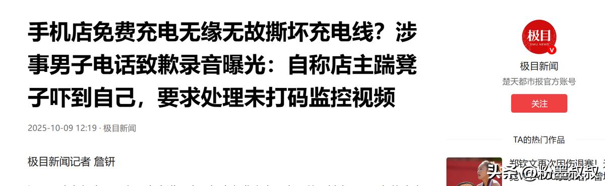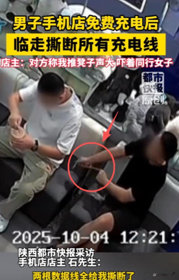 太坏了!山东烟台,一黑衣男子和朋友们结伴到一家店里免费给手机充电,结果临走之时,这名男子竟故意扯断店里提供的免费充电数据线,而男子的这番操作,让与其同行的朋友都觉得有些不可思议。事后店老板看到这一幕时,也觉得不解和生气。 山东烟台街头有不少那种接地气的小店,老板石先生开的就是其中一家,平时卖卖饮料零食,还特意在墙角拉了插排,摆了两张小凳子,免费给路过的人充手机电。 他总说 “出门在外谁没个手机没电的时候,能帮就帮一把”,这事儿一干就是三年,来充电的街坊邻居、游客都夸他实在,店里生意也因此多了点人气,可谁能想到10 月 4 号那天,这份好心却被人当成了驴肝肺,一个黑衣男子干的事儿,让石先生又气又不解,连旁边看到的人都忍不住说 “太坏了!” 那天下午不算忙,石先生在柜台里整理货,进来一伙年轻人三男一女,说说笑笑的,其中穿黑衣的小伙子肖某,一进门就问能不能充电,石先生笑着指了指墙角:“随便充,凳子上坐会儿就行,” 肖某和同伴就把手机插上,几个人围着凳子聊天,偶尔还拿出零食分着吃,看着跟普通游客没两样。 石先生也没多留意,继续忙自己的活儿,想着等他们充得差不多了自然会走,大概过了半个多小时,那伙人收拾东西准备离开。 石先生抬头看了一眼,见他们拔了充电线,还以为挺懂规矩结果没等他低下头,就瞥见肖某突然伸手,抓住还插在插排上的数据线,猛得往身后一拽 ——“啪” 的一声,数据线的接头直接被扯断,半截还留在插排里,另半截掉在地上线芯都露出来了。 石先生当时就愣了,心想 “这是干啥?没拿稳?” 可再看肖某,他脸上没半点慌乱,反而带着点无所谓的劲儿,把扯断的数据线往地上一扔,转身就跟同伴走了。 他同行的几个人里,有个穿黑衣的姑娘还笑了一下,另个小伙子皱了皱眉,却没说一句话,连那个穿白衣的姑娘曾某也只是跟着走,仿佛没看见刚才那一幕。石先生赶紧喊了一声 “哎,你这线……”,可人家压根没回头,很快就没影了。 等石先生走过去捡起断了的数据线,才发现接头处都被扯变形了,根本没法再用,他越想越气:这线虽说不值多少钱,也就百八十块,可这是免费给大家用的,没招他没惹他怎么就故意给扯断了? 他实在想不通,就调出店里的监控再看一遍,清清楚楚拍到肖某是故意拽的,不是不小心这一下更窝火了,自己好心提供方便,换来的却是这种恶意破坏,搁谁身上不生气啊? 后来石先生通过周围店铺的监控,好不容易找到了肖某同伴的联系方式,打过去想问问情况,结果先接到了肖某的电话,本以为对方会道个歉,没成想肖某一开口就装傻,说 “我没扯断啊,是不是你自己线不结实?” 等石先生说有监控,肖某又开始找借口,说当时石先生顺脚挪了下凳子,吓到他了,所以才 “不小心” 弄断的。 最后见实在瞒不过,他又说 “多大点事儿,我回烟台请你吃顿饭不就完了”,那语气轻描淡写的,根本没把这当回事,石先生跟他理论了两句,肖某还恼羞成怒,最后骂了句脏话就挂了电话。 更让人心寒的是肖某那些同伴,石先生后来联系上曾某,对方一开口就火了,不是为肖某的行为道歉,而是抱怨监控视频里自己没被打码,被网友骂了还一个劲儿说 “我跟他不熟早没联系了,别把我扯进去”,急着跟肖某撇清关系,还有人爆料说,肖某上学的时候就爱耍小聪明,遇事总爱甩锅给别人,这次干出这种事也不奇怪。 石先生说他心疼的不是那根数据线,是自己这三年的心意。本来想着能帮大家一把,让出门在外的人能方便点,结果遇到这种事,以后再想提供免费充电,都有点犹豫了,怕再遇到故意破坏的人。 周围街坊知道了这事,也都替他抱不平,说 “这小伙子也太坏了,人家好心帮你,你不感恩就算了,还故意搞破坏,这人品也太差了!” 其实大家出门在外,互相帮衬是常事,人家免费给你充电,是情分不是本分,就算不感谢也不该搞这种恶意破坏,肖某这么做不光是毁了一根数据线,更是伤了那些愿意行善的人的心,也让人与人之间的信任又少了一分。 (信息来源:极目新闻——手机店免费充电无缘无故撕坏充电线?涉事男子电话致歉录音曝光:自称店主踹凳子吓到自己,要求处理未打码监控视频)