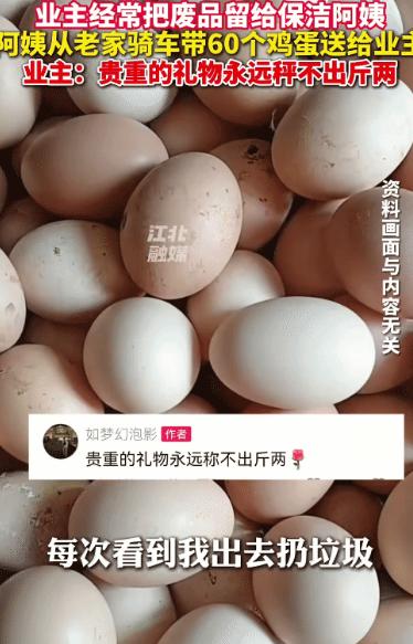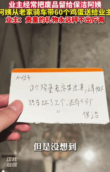 暖心!江苏南京,男子经常把废品留给保洁阿姨。没想到,假期回来,在门口发现两袋土鸡蛋和一张纸条。他看了纸条后才知是保洁阿姨送的。他感叹:贵重的礼物永远秤不出斤两。网友:双向奔赴的善良。 南京秦淮区那个老小区,便利店老板娘赵姐守了八年。 店开在3栋楼下,早上六点开门,晚上十点关门,小区里谁几点来买什么、家里有啥情况,她大多门清。 但3栋的小王和保洁张阿姨那点事儿,还是让她时不时跟来买烟的老主顾念叨——不是八卦,是觉得暖。 小王是个程序员,每天早上七点半准点来店里买豆浆和包子,偶尔加班晚了,晚上九点多会来买桶泡面。 赵姐注意到,这小伙子每次来都拎着个折叠布袋,有时候袋子里装着叠得方方正正的纸箱,路过店门口时会特意往旁边的保洁工具房瞅一眼。 有次下雨天,小王买完早餐没走,从布袋里掏出几个用塑料袋裹得严严实实的纸箱,放在工具房门口,还贴了张便利贴。 赵姐凑过去看,上面写着“阿姨,纸箱用塑料袋包了,您拿的时候别沾到雨”。 后来才知道,那些纸箱是小王攒的快递盒,专门留给负责3栋清洁的张阿姨。 张阿姨每天早上五点多就到小区,先在工具房整理清洁用品,再去扫楼。 路过便利店时,要是赵姐已经开门,会进来买个一块五的馒头当早餐。 有次赵姐看她弯腰整理废品时腰不太舒服,特意多煮了杯热粥给她,张阿姨非要给钱,赵姐没要,她就记在了心里。 从那以后,张阿姨偶尔会把老家带来的小青菜、红薯放在便利店,托赵姐转交给小王,说“小伙子上班辛苦,让他煮面时加点菜”。 国庆前三天,张阿姨来店里买东西,是两卷透明胶带和一个大塑料袋。 她跟赵姐说要回淮安老家几天,还问小王最近有没有来买早餐。 赵姐说小王前几天加班多,早上来的晚,有时候直接去公司了,不过纸箱还是每天放在工具房门口。 张阿姨听了,点点头,又买了包纸巾揣在兜里,说“怕路上用得上”。 国庆收假那天早上,赵姐刚开门,就看见张阿姨提着两个布袋子往3栋走。 袋子上沾着泥,还透着股土腥味,张阿姨走得很小心,一只手一直扶着袋子。 后来小王中午来买矿泉水时,跟赵姐说门口多了袋鸡蛋,里面还有张纸条,是张阿姨送的。 赵姐问他鸡蛋有多少,小王说数了下,58个,每个都用稻草裹着,说是老家土鸡下的,骑车回来时碰坏了2个。 当天下午,小王又来店里了,这次买了袋20斤的大米和一桶食用油。 他跟赵姐说想把东西送给张阿姨,可不知道她在哪,问能不能暂时放在店里,等张阿姨来取。 赵姐爽快地答应了,还帮他把米油放在了柜台后面。 傍晚张阿姨来取东西时,看到米油愣了下,跟赵姐说“这小伙子太客气了,我就是送点鸡蛋,怎么还买这么贵的东西”。 她想把米油送回去,赵姐劝她“小伙子也是一片心意,你收下,以后多帮他留意着点门口的垃圾就行”,张阿姨这才收下,又从布袋子里掏出把新鲜青菜,让赵姐转交给小王。 后来这事儿在小区里慢慢传开了,不少住户来店里时都会聊起。 住在2栋的李叔说,现在他也把家里的纸箱留着,放在工具房门口给张阿姨。 5栋的王女士说,上次看到张阿姨帮小王带垃圾,现在她也会把快递盒叠好放在门口,张阿姨路过时会顺手收走。 赵姐看着这些,总觉得心里踏实——不过是几个纸箱、一袋鸡蛋,却让原本不怎么熟的邻居多了份惦记。 现在每天早上,小王来买早餐时,会顺便问赵姐张阿姨有没有来。 张阿姨来买馒头时,也会问小王最近忙不忙。 有时候小王加班晚了,会多买个包子放在店里,托赵姐留给第二天早上来的张阿姨。 张阿姨回老家时,也会特意带点红薯、玉米,让赵姐转交给小王。 赵姐的便利店,慢慢成了这俩人传递心意的小站点,每天都有暖乎乎的事儿在这儿发生。 有网友表示,看完这事儿特戳心!现在小区里邻居都不熟,没想到几个纸箱、一袋鸡蛋能拉近距离,赵姐的便利店像个 “暖心中转站”,这种不刻意的善意比啥都珍贵,希望我住的小区也能有这样的温暖。 还有网友表示,小王贴便利贴提醒阿姨避雨、张阿姨记着给小王带青菜,细节太打动人了!不是啥贵重东西,却满是真心,要是大家都能多为别人想一点,生活肯定会更暖。 也有网友认为,李叔、王女士受影响也留纸箱,这就是善意的传递吧!一件小事能带动整个小区的氛围,赵姐能一直帮着传递心意,也是个热心人,这样的邻里情太难得。 现在快节奏生活里,这种朴素的惦记太少见了,希望多些这样的暖心故事。 那么到最后,你们是怎么看的呢? 如果各位看官老爷们已经选择阅读了此文,麻烦您点一下关注,既方便您进行讨论和分享,又能给带来不一样的参与感,感谢各位看官老爷们的支持!