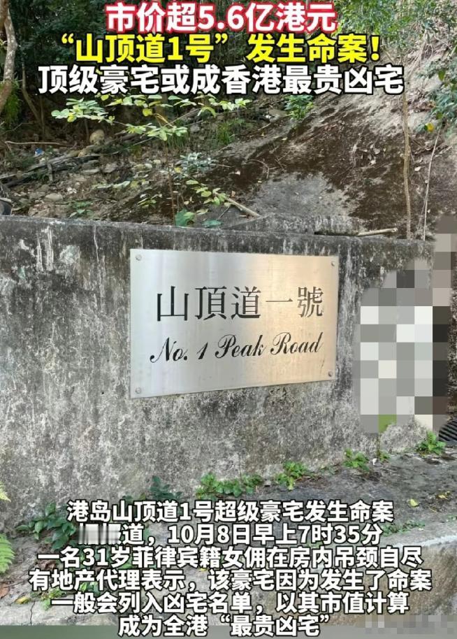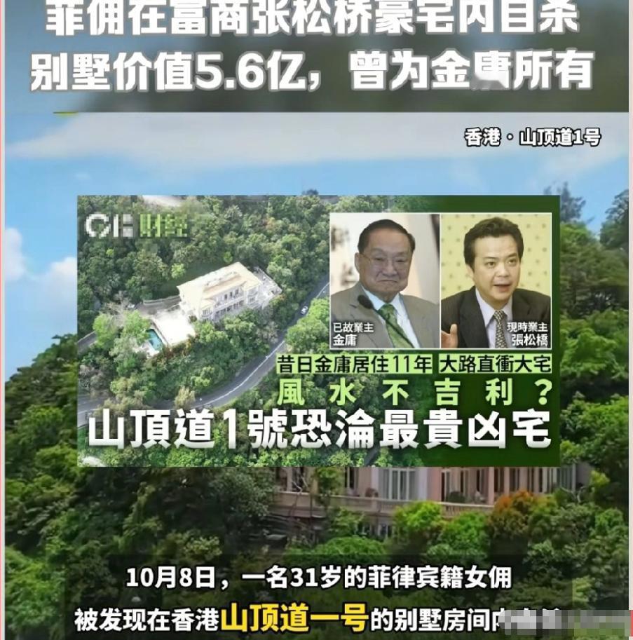 31岁女菲佣在富商张松桥豪宅内上吊自杀,豪宅或成凶宅,曾经是金庸旧居 熟悉香港地产圈的人都知道,山顶道一带向来是顶级豪宅的聚集地,这里的每一栋房子几乎都带着“传奇”标签。 而就在10月8日早上,山顶道1号的一栋豪宅里,一名31岁的菲律宾籍家政人员,在自己的房间里上吊身亡。 这栋房子不是普通豪宅,它曾是武侠小说大师金庸的居所,如今却因为这起命案,被贴上了“全港最贵凶宅”的标签。 警方接到报案后很快赶到现场,经过勘查,他们发现现场没有留下遗书,也没有找到任何可疑的痕迹,最终给出了“无可疑之处”的结论。 这个结论暂时平息了关于“他杀”的猜测,但31岁生命的逝去,仍让这栋本就充满故事的房子,多了一层难以抹去的沉重。 按照香港当地的习惯,只要物业里发生过这类非自然死亡事件,就会被认定为“凶宅”,而这栋山顶道1号的豪宅,如今市场估值已经超过5.6亿港元,“全港最贵凶宅”的名头,也就这样落在了它的身上。 要说这栋豪宅的故事,得从上个世纪80年代初说起。 最开始,这栋房子是美国领事馆的产业,后来领事馆以2400万港元的价格,把它卖给了一位香港本地富商。 那位富商住了将近3年,又转手卖给了金庸。 从1985年到1996年,金庸夫妇在这栋房子里住了整整11年,这段时间也是金庸作品影响力持续扩大的时期。 不过,金庸当初买这房子时,还曾有过犹豫。 因为房子的大门正对着一条马路,按照香港人看重的风水说法,这不算“吉利”。 但犹豫过后,他还是搬了进去,能让金庸放下风水顾虑的房子,可见他对这里的喜爱。 金庸之后,这栋房子被转给了李同乐旗下的公司,后来李同乐因为经济上出了问题,又把房子卖给了张松桥。 张松桥在香港商界有个响亮的名号,叫“重庆李嘉诚”,今年61岁的他,16岁就到香港闯荡,现在已经是香港永久居民,还担任着中渝置地和港通控股两家上市公司的主席。 根据《2025胡润全球富豪榜》的数据,他的个人财富大约有185亿元人民币。 2004年,张松桥以1.38亿港元的价格买下这栋当时已经有些破旧的房子,之后又进行了重建,把它改成了一栋三层的独立别墅。 现在,张松桥依然住在这栋房子里,而且他还在重庆开发了同名的住宅项目,看得出来他对“山顶道1号”这个名字的偏爱。 在香港,不光是金庸这样的文化名人看重风水,很多富豪在选房子时,也会把风水当成重要考量。 就像视后杨茜尧,之前就有消息说她特意花大价钱请风水大师帮忙找“旺宅”,最后选定的房子,据说对她和丈夫罗子溢的事业都有帮助。 事实也确实如此,杨茜尧夫妇搬进去后,罗子溢的事业明显有了起色,近几年他参演的《执法者们》《金式森林》都是热播剧,演技也得到了不少观众的好评,虽然还没拿到视帝,但手里的影视资源已经越来越好了。 当然,罗子溢能有今天的成绩,主要还是靠他自己的努力,但这也从侧面反映出,风水在香港富豪的生活里,确实占着不小的分量。 今天的分享到这里就结束了,大家对此事有何看法,欢迎在评论区留言和讨论,感兴趣的可以点击头像加关注,我将每日更新优质内容,我们下期见。 信源: 原文登载于南方都市报2025年10月10日关于《金庸曾居住的香港山顶道豪宅发生命案!31岁女菲佣上吊自杀》的报道