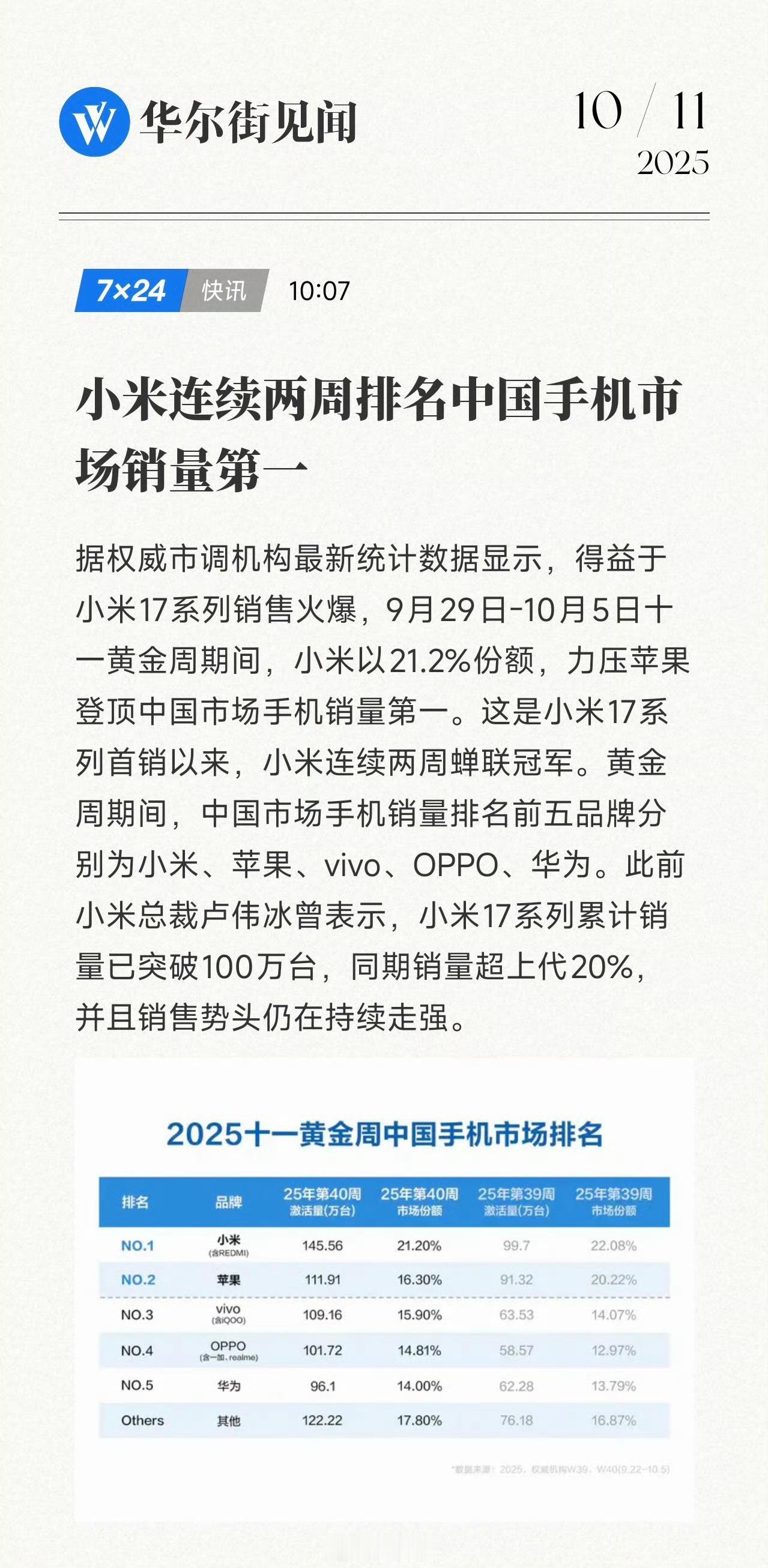 目前小米17的表现和我们最初的预期完全一致,销量说话:小米领先苹果登顶黄金周销量第一,iPhone17系列也是刚刚发布,这两周连续领先,有含金量吧?[doge]