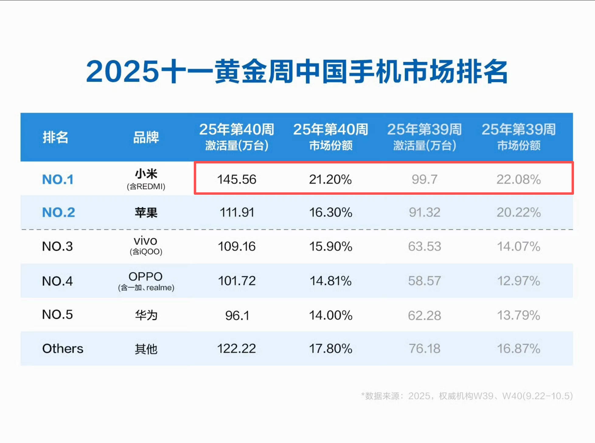 昨天发错了,小米不是单周第一,而是W39和W40连续两周第一 (9.22-10.5)。