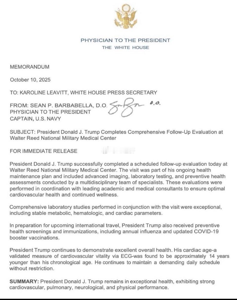 白宫医生公布:特朗普打了今年的流感疫苗和新冠疫苗加强针。