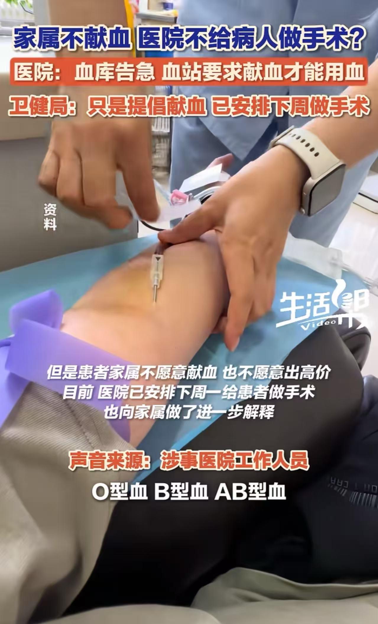 炸锅了!四川广安,一患者家属发视频称:家属不献血,医院不给病人做手术!”而医院工作人员回应:血库告急,血战要求献血才能用血,我们也没办法。卫健局:只是提醒献血,没有强制!网友:和医护有啥关系啊,巧妇难为无米之炊! 患者家属满脸愤懑地称,医生竟要求他们在手术前先去献血,如果不献血,手术时没血可用,这手术就没法做。 家属们一听,顿时怒火中烧。在他们看来,献血本应是出于自愿的善举,怎么能被强制要求呢?这种做法分明就是拿病人的安危来“绑架”家属,让他们陷入两难的境地。 于是家属将这事情发布到了网上,希望广大网友能帮忙评评理。 面对家属的质疑,医院方面给出了回应。医院表示,这可不是医生自己提出来的要求,而是血站那边有这样的规定,只有献血了才能使用相应的血液。如今血站的血源十分紧张,库存的血只能优先保证急诊用血。血库里没血,医院就算想给患者做手术,也是巧妇难为无米之炊,实在没有办法。 卫健局的工作人员也对此事发表了看法。他们称,目前血库的血液确实处于紧张状态,但并没有强制要求患者家属献血,只是提倡大家献血。如果家属愿意献血,那么用血的费用会相对低一些。而这个患者家属既不愿意献血,也不愿意出高价购买血液。不过,目前医院已经做出了安排,计划在下周一为患者进行手术。 此事一经曝光,立刻在网络上引发了热议。有网友说,我这边也是这样,上个月刚经历过,有献血证没用,必须当场献800CC,找了3个朋友一共献了900CC才给手术! 也有网友说,自己的亲人都不愿意献血急用,又有谁有义务去为他献血?医生为他冶病的意义何在?什么都是相向的,只有他为人人,人人再为他! 还有网友说,本人亲身经历,曾经多次献血。老婆手术还要互助献血1000多毫升,手术出血量仅200毫升。互助的1000多毫升没用到,给医院自行处理。凉了多少献血者的心。 血库告急是客观事实,但以“不献血就不做手术”这种方式来解决问题,无疑是将患者和家属推到了道德的悬崖边上。医院和血站或许有他们的无奈,但这种简单粗暴的做法,伤害的不仅是患者和家属的感情,更是整个社会对献血事业的信任。 不是每个病人的家属,身体条件都允许献血,他们也没能力喊亲戚朋友帮忙献,设置“不献血就不做手术”的条件,为耽误病情。 我们不能让献血这件本应充满爱心的善事,变成一种变相的强制交易。相关部门应该积极寻找更合理、更人性化的解决方案,而不是让患者和家属在病痛和道德压力下苦苦挣扎。