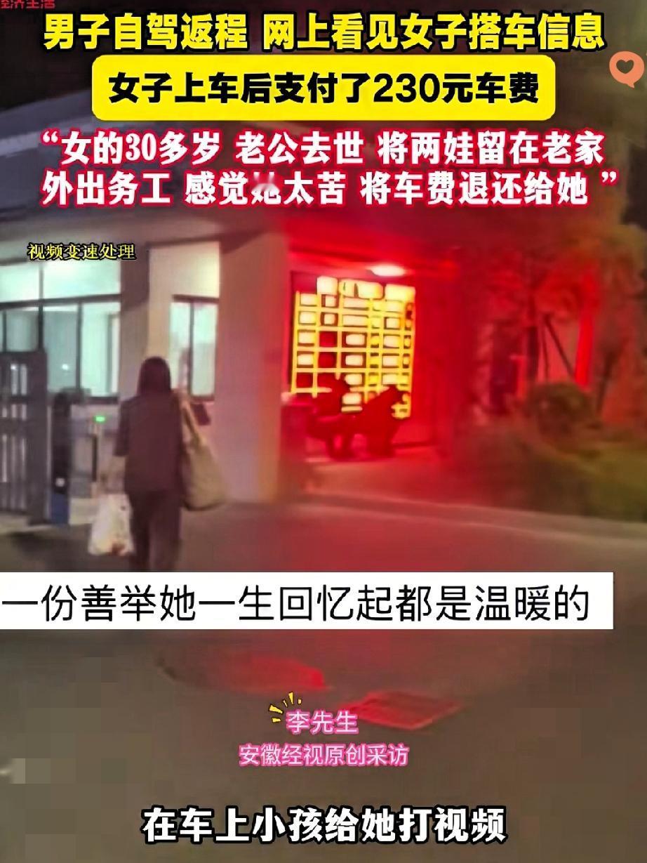 河南民权这位司机大哥退的230块,比好多大张旗鼓的“善举”都让人鼻酸! 本来他国庆返程想捎个人凑点油钱,接上那位大姐后,撞见她跟家里俩娃视频哭到抽气,才知道她丈夫走了,一个人扛着13岁和5岁孩子的生活费,孤零零去打工。 他没说啥大道理,送到厂门口就把车费塞回去了。 其实最难得的不是这230块,是他没把善意当“施舍”,只是看见另一个人的难时,愿意多让一步——这种普通人的共情,比任何口号都暖。 就像网友说的,单亲妈妈们记着的从来不是钱,是有人愿意看见她们的苦。 你们有没有被陌生人的小举动戳到过?比如一次顺路帮忙、一句随口提醒,来聊聊你的故事呗!