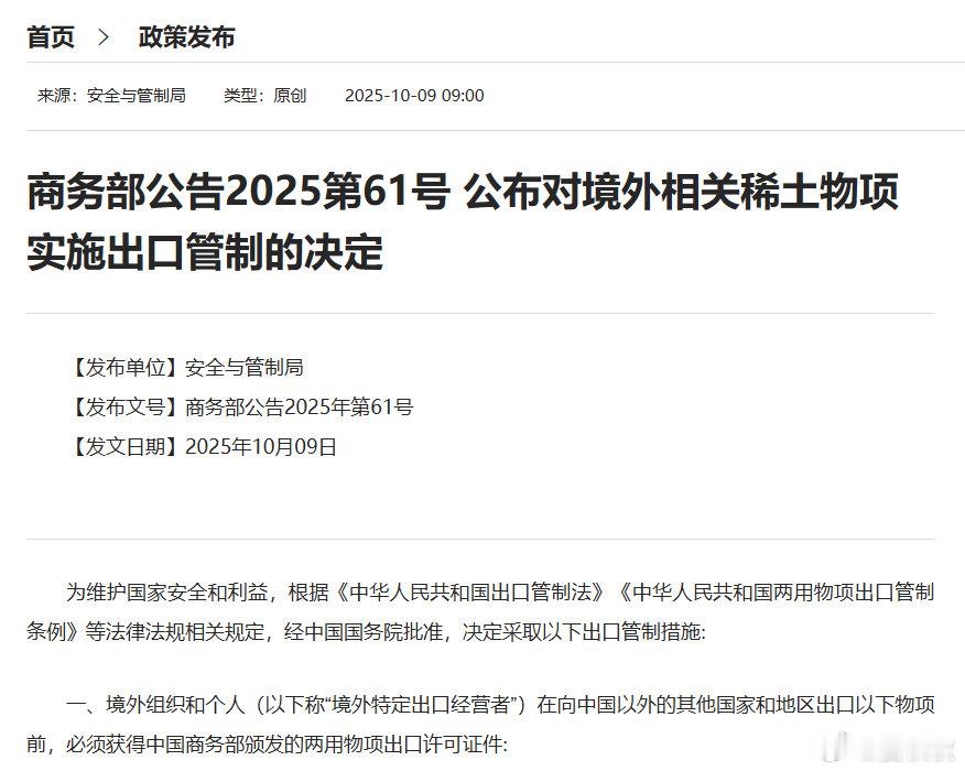 10月9日,中国发4则公告,宣布对超硬材料、锂电池和人造石墨负极材料、部分稀土、部分稀土设备和原辅料进行出口管制。
