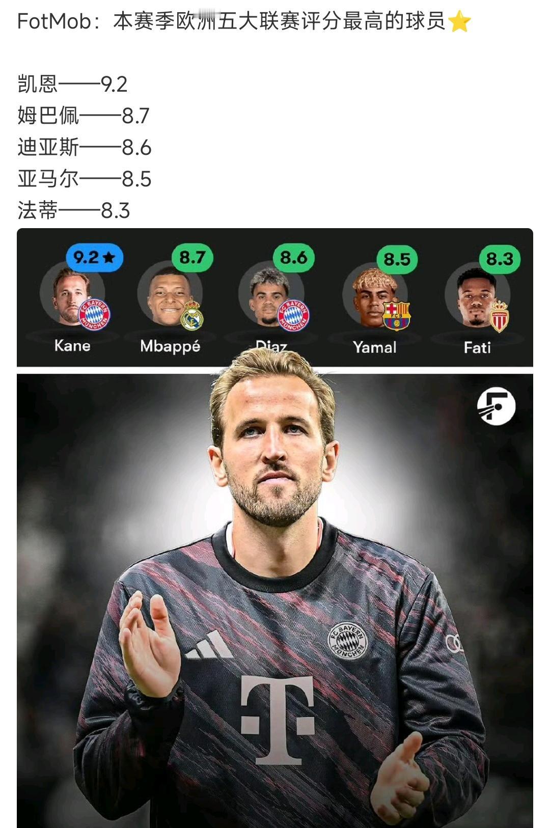 本赛季欧洲评分最高的球员,都来自于超级豪门。 两个拜仁球员,热刺和利物浦卖便宜了,英超球队哭晕在厕所。 两个巴萨球员,法蒂曾经是巴萨10号呀,如果在巴萨和亚马尔组成双子星?? 一个皇马球员,大巴黎真不想姆巴佩离开,回来好不好?? 这五个人最强,其中凯恩表现最佳![灵光一闪]